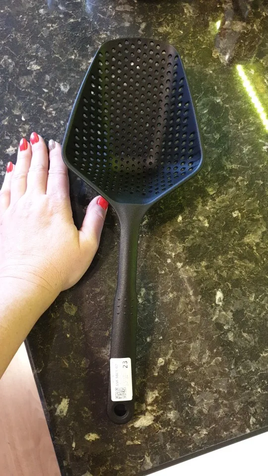 La pelle filtrante à légumes ou autres aliments est très grande mais tout à fait conforme au descriptif. Produit à recommander +++ Grand merci au vendeur pour son envoi hyper rapide (8 jours) et son emballage ultra soigné).