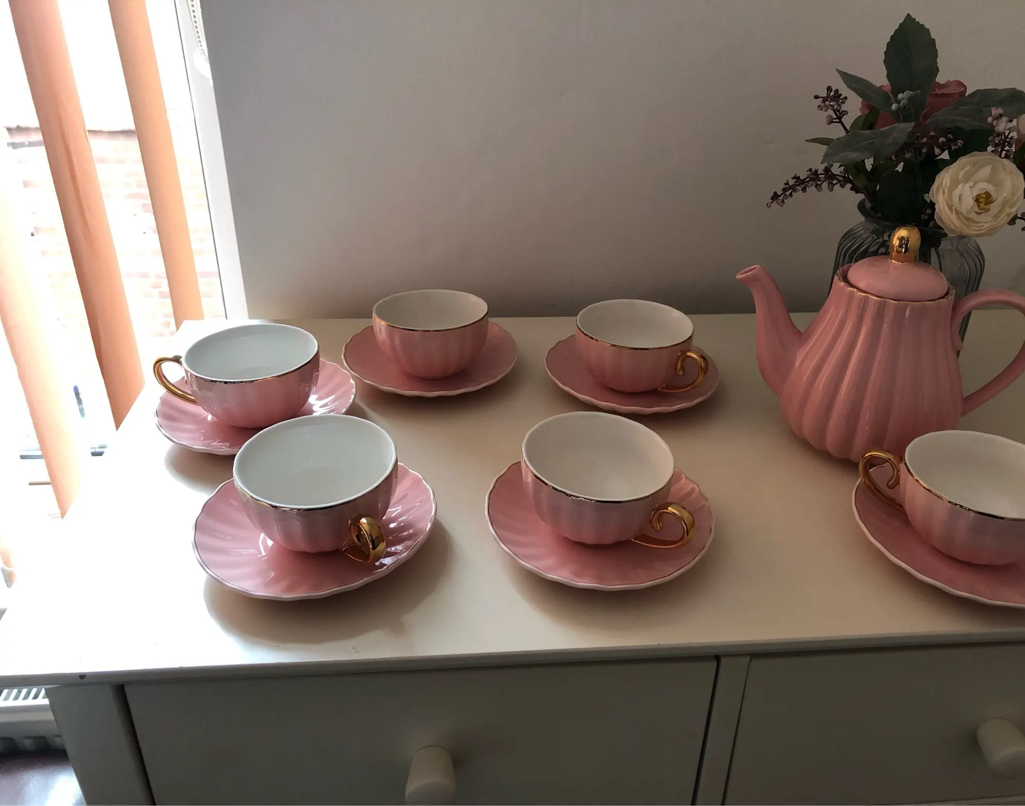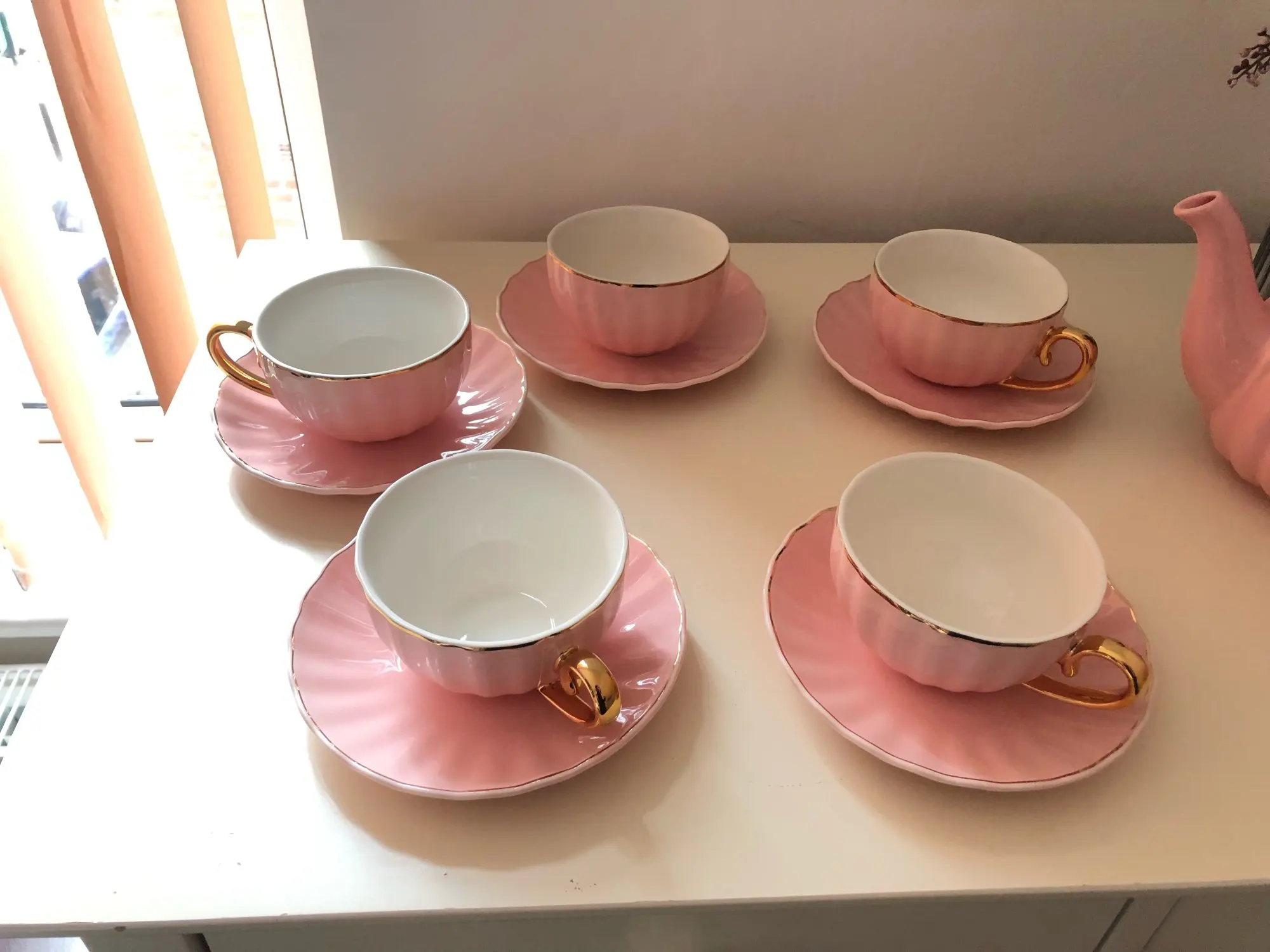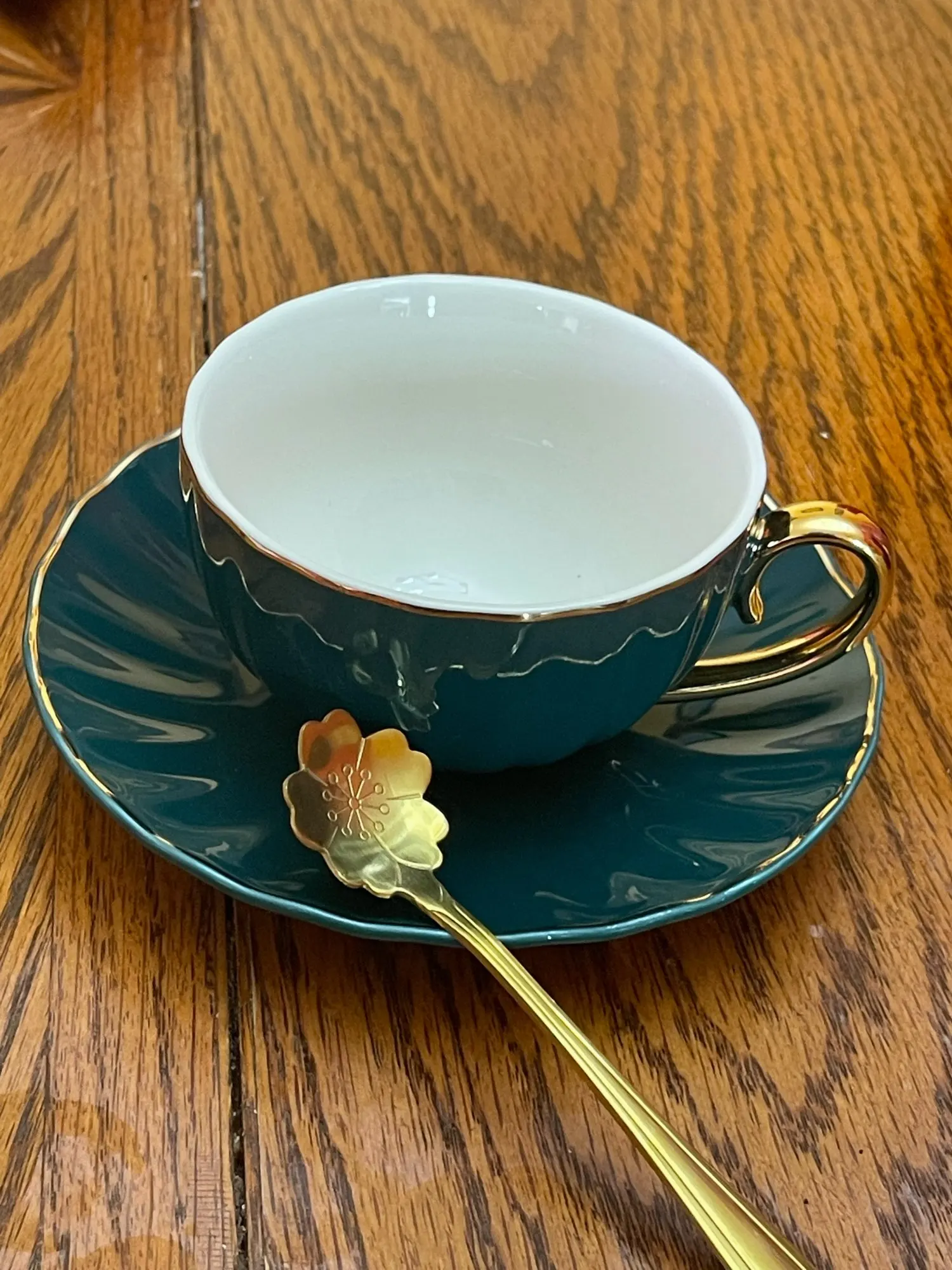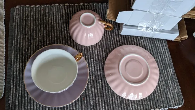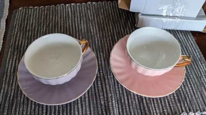 Beautiful cups and saucers. Unfortunately mine didn't came with any teaspoon! Bought the teapot to match the cups.
