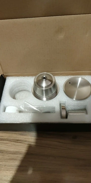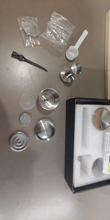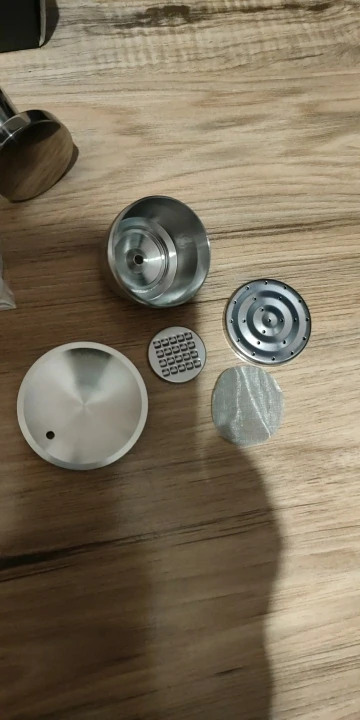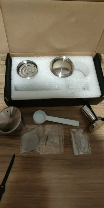 Rozmiar: całkowita wysokość kapsułki 32mm, górna średnica 53mm. Ubijak do kawy o wysokości 47mm, średnica podstawy 38mm