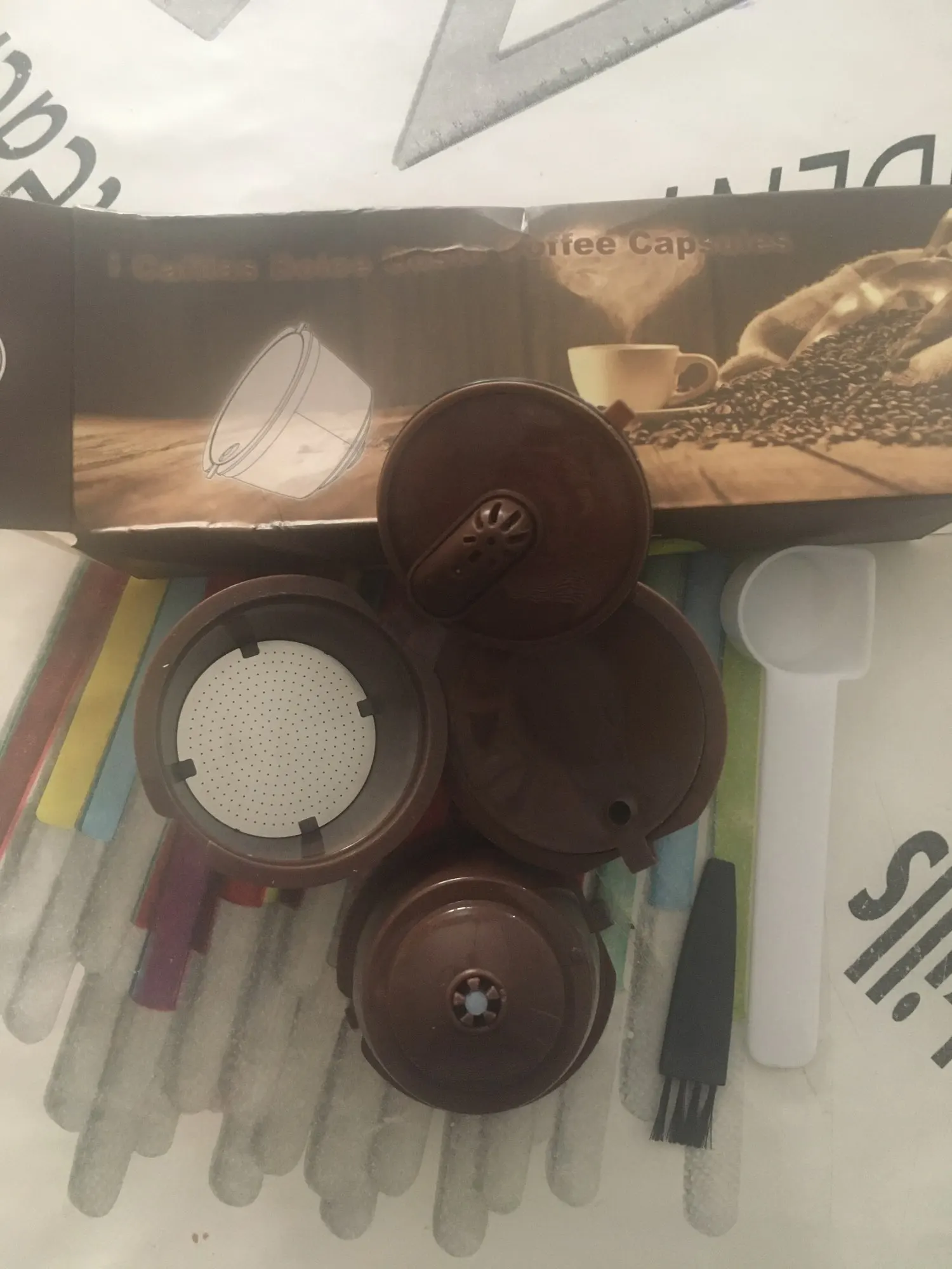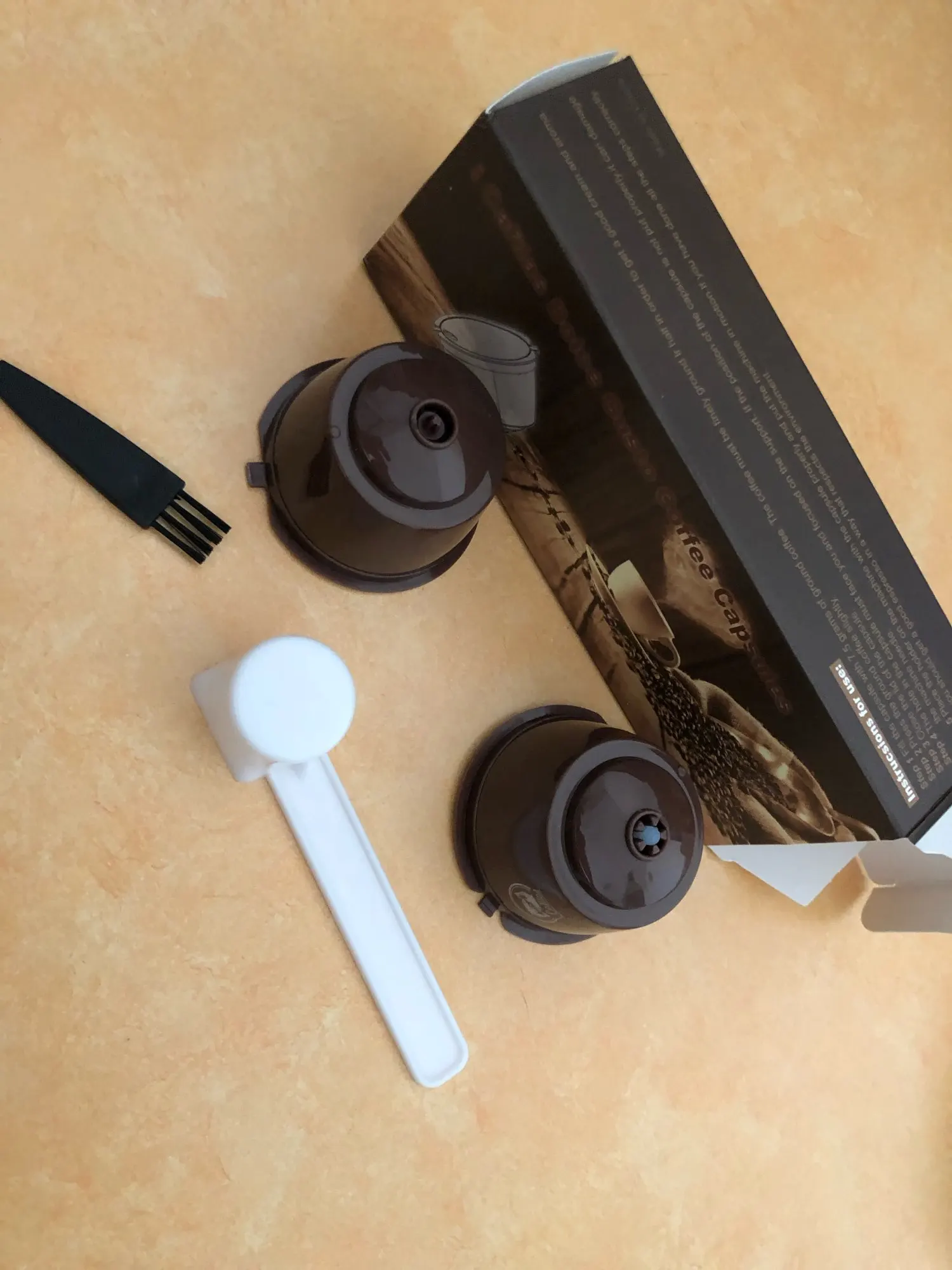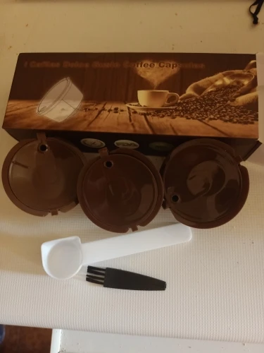 Came well packed with measuring soon and a brush to clean the pods. Easy to use, perfectly adjusted for my old Dolce Gusto. I’m very satisfied with my purchase and will order more.