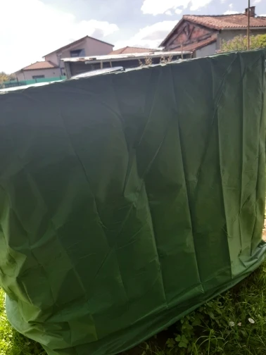 Belle matière synthétique, a l'air vraiment solide, bien opaque. La couleur verte se fond bien dans le jardin et la taille est parfaite ! On ne voit plus du tout la cuve. Il faudra voir dans le temps si elle est résistante.