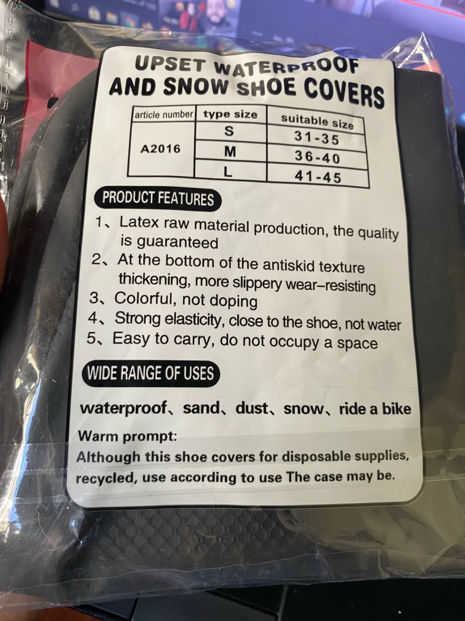 Cechy:-unikalna wodoodporna konstrukcja zapewnia bezpieczeństwo. -Lekki i łatwy do przenoszenia, nie zajmuje miejsca. -Świetne na jazda motocyklem, jazda na rowerze, narciarstwo, snowboard, wędkarstwo, wspinaczka i inne zajęcia na świeżym powietrzu w deszczowe dni, te buty są najlepszym wyborem. Specyfikacja: materiał: guma kolor: niebieski, żółty, czarny, różowy rozmiar: S,M,L (35)S: 31-35; (40)M:36-40; (45)L:41-45. Pakiet zawiera: 1 X para pokrowiec na buty (buty nie wliczone) uwaga: ze względu na różnicę światła i ekranu, kolor przedmiotu może się nieznacznie różnić od koloru na zdjęciu. Proszę zrozumieć. Upewnij się, że nie masz nic przeciwko, zanim złożysz ofertę. Proszę pozwolić 1-5mm różnice ze względu na pomiarze ręcznym.