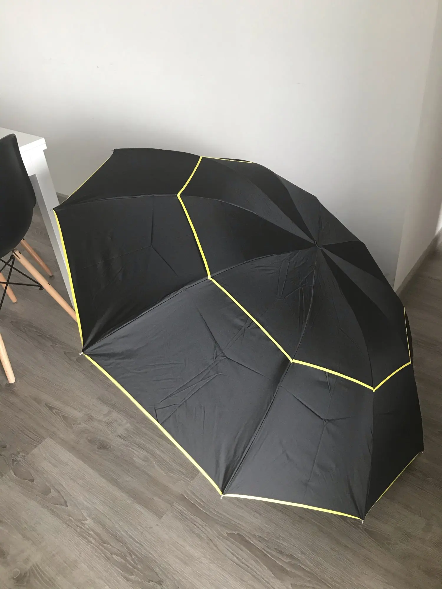 Abierto es muy grande y plegado es parecido de tamaño al resto de paraguas plegables. Al ser tan grande a veces te chocas al pasar cerca de la gente o por sitios estrechos. Llego en un par de días.