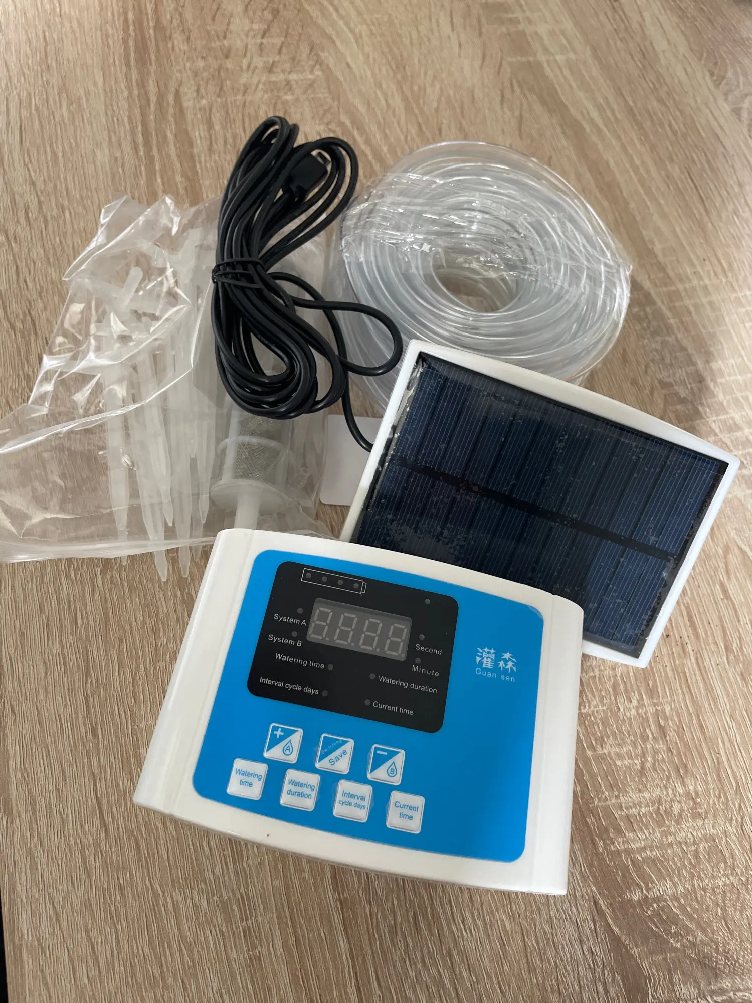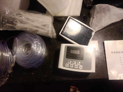 Works just fine. Checked USB plug which is seated securely. Programming is a little bit tricky but all in the English manual. Had to find out that the pump plug near display side is water in and the one near bottom/A-B character mark is out. bad plastic smelling hoses. Solar panel works ok. Good for holiday irrigation. Clear transparent hoses may catch alga at some point. Delivery was delayed due to general problems with German costums these days. Absolute worth its money!