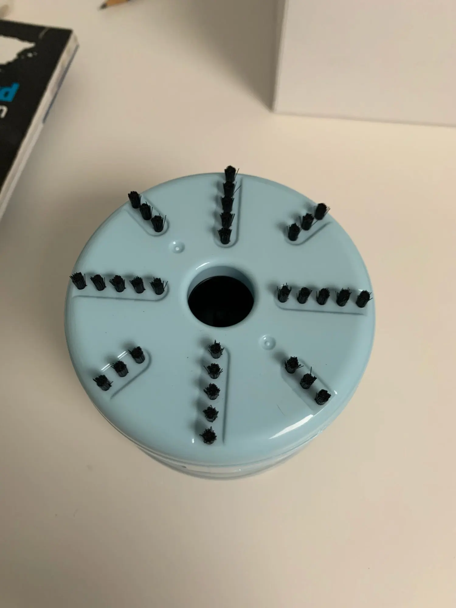 Llegó en 2 semanas. Funciona perfectamente y aspira genial. No me había fijado que era algo diferente a la foto, pero no hay problema porque el color lo mantiene. Es más, asi azul entero lo prefiero.