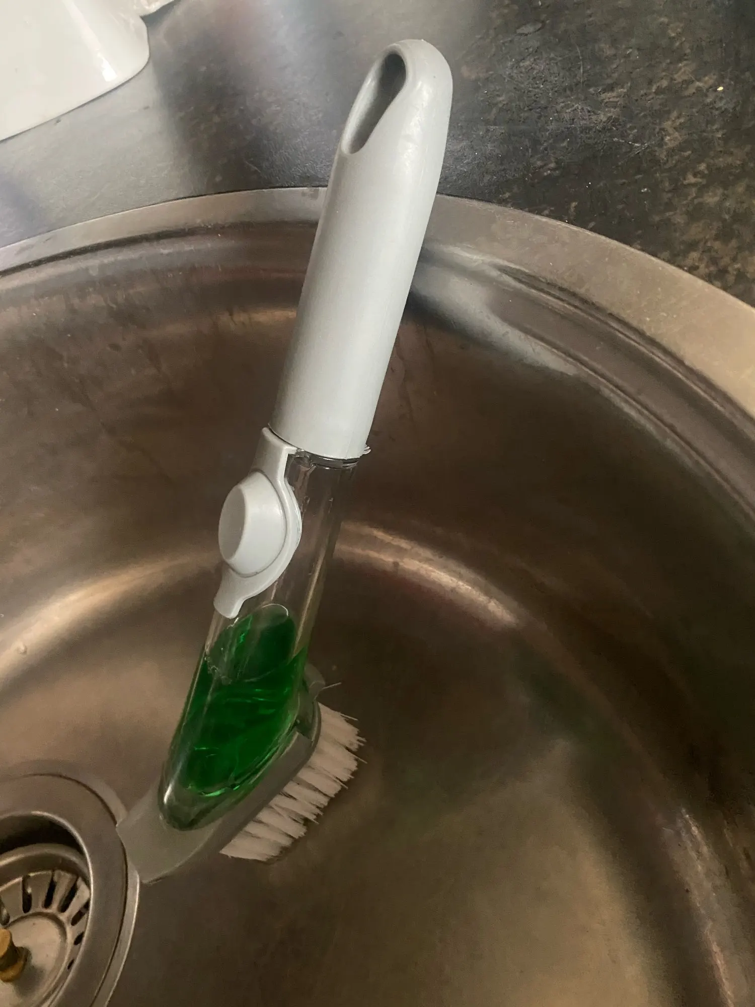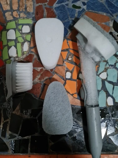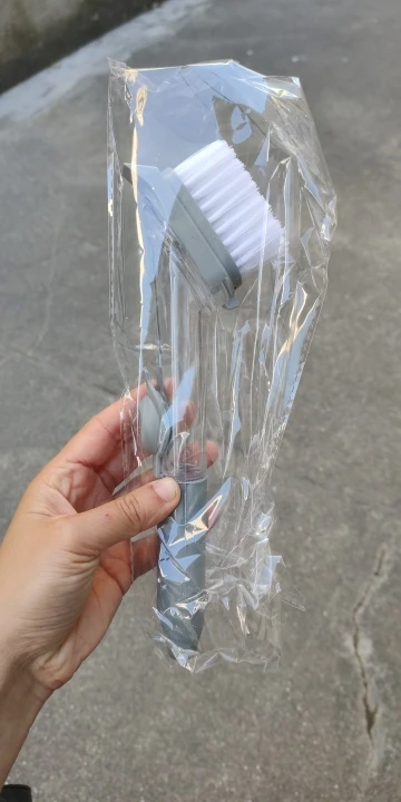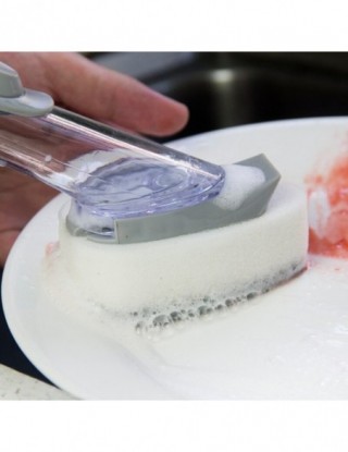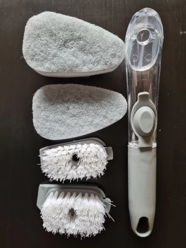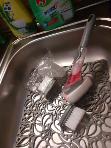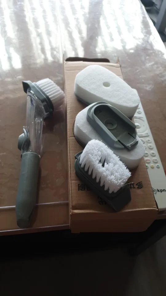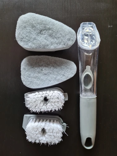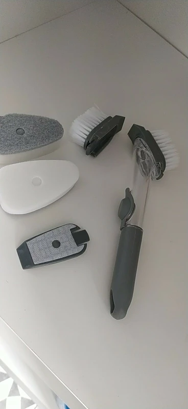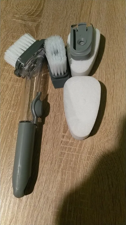 【Dozownik mydła 】 szczotka do szorowania kuchennego jest wyposażona w dozownik o dużej pojemności 50ML i dozuje mydło na żądanie za pomocą lekkiego naciśnięcia przycisku. Bez względu na to, jak umieszczony, silikonowy zawór może zapobiec wyciekaniu mydelniczka