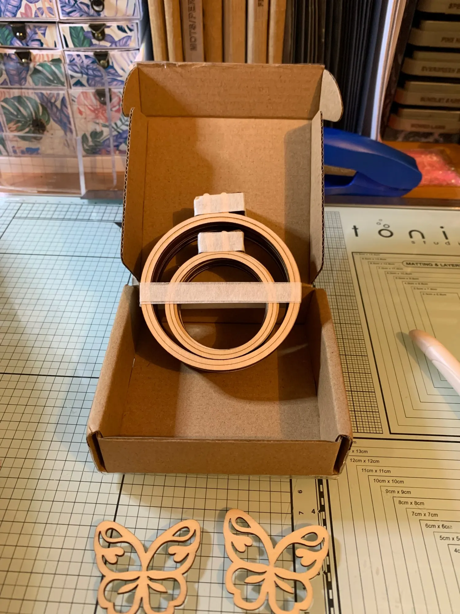 Ravie de mon achat. Réception très rapide. Tout était bien emballé dans un carton et est arrivé nickel. Merci pour les 2 papillons. Ils sont très jolis tout comme les cercles à broder. Je recommande sans tarder chez vous je suis vraiment très contente de cet achat.