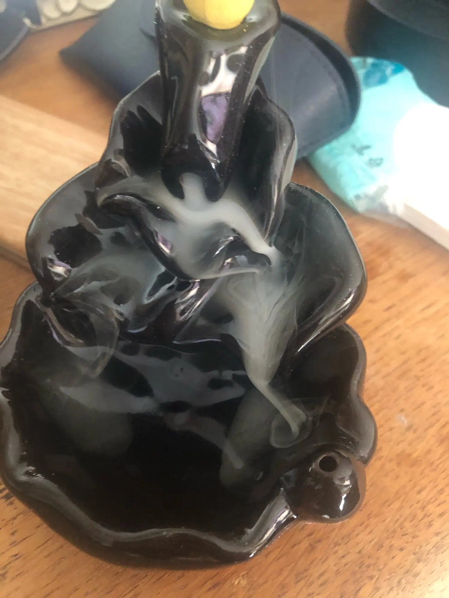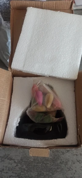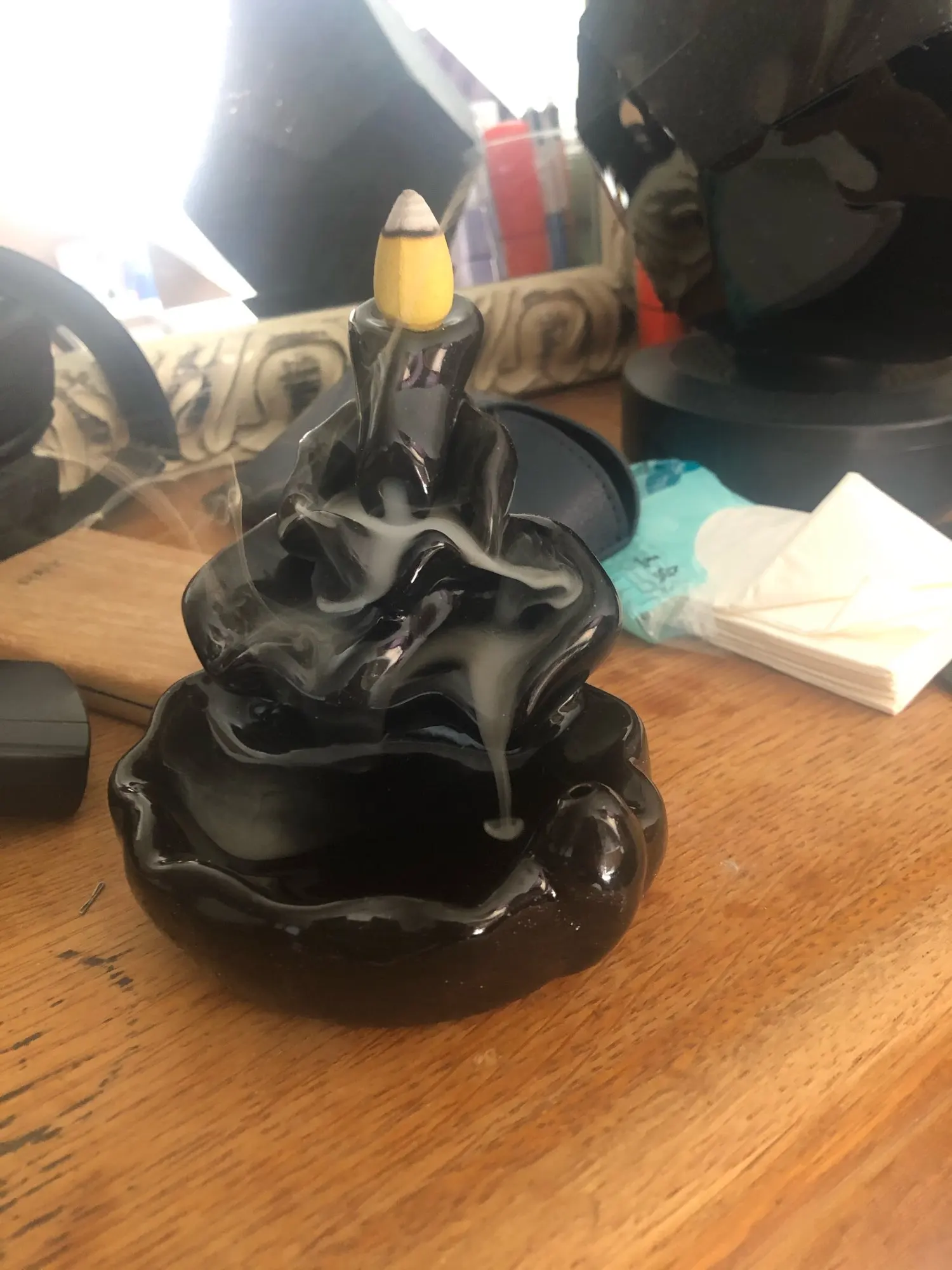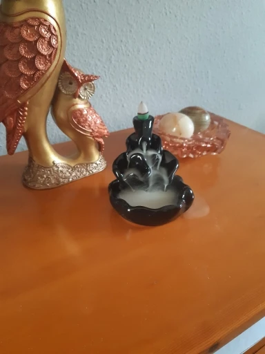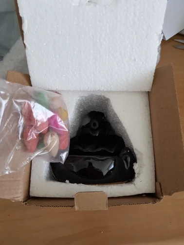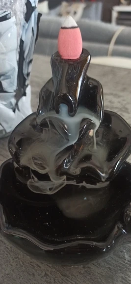 Does its function well. Has a small scratch on the back, almost you cannot see it. Shame the incense holder faces outward so the ashes do not fall into the burner.