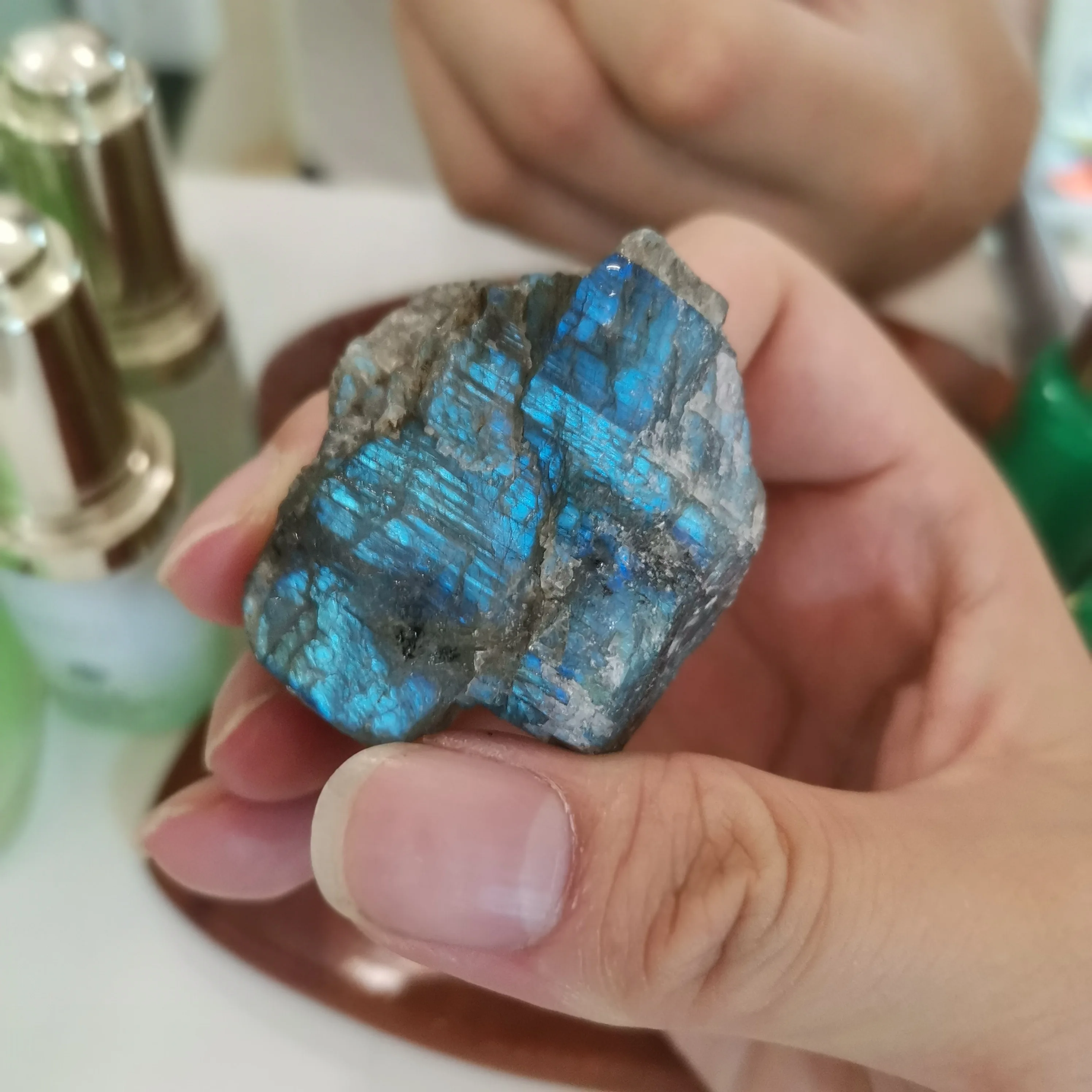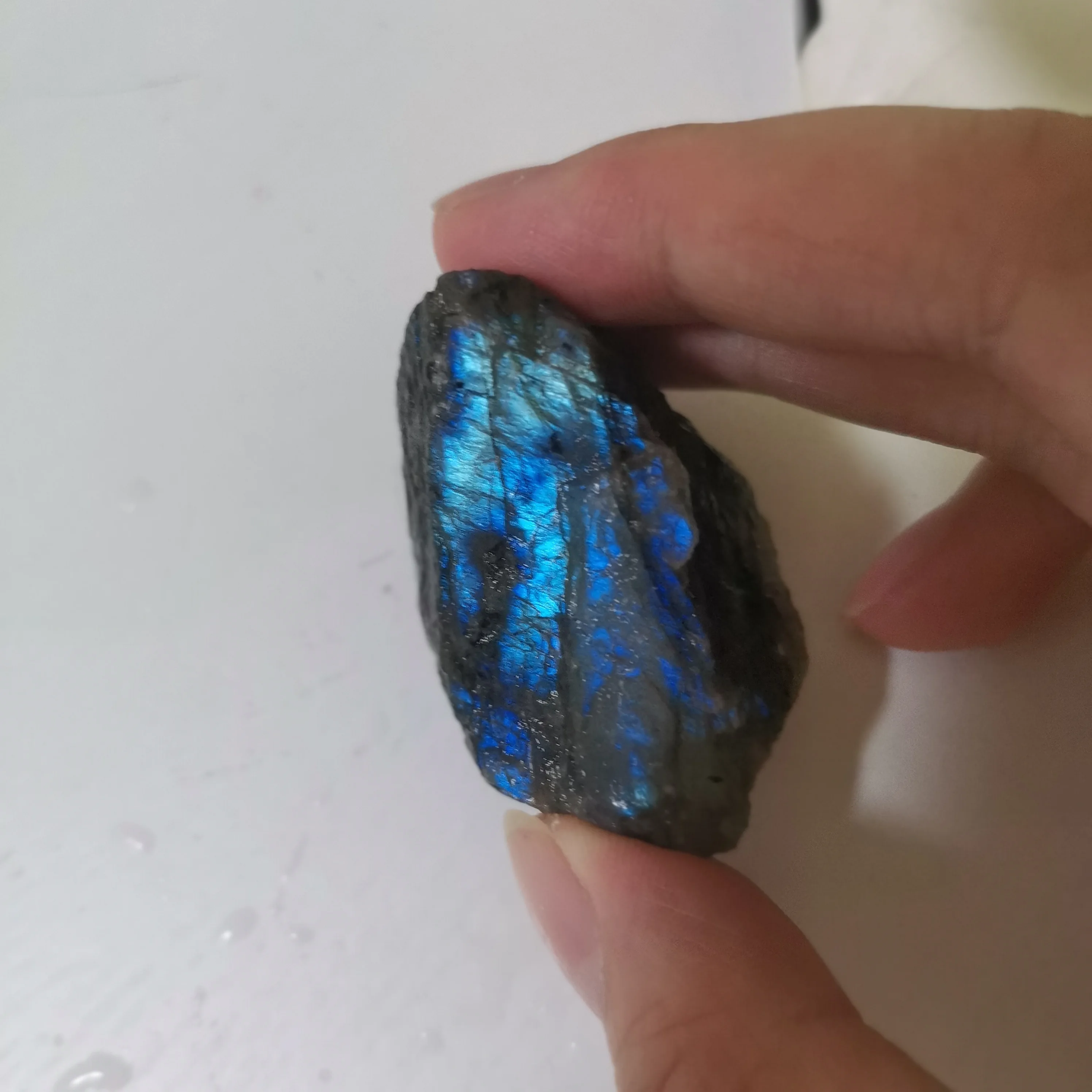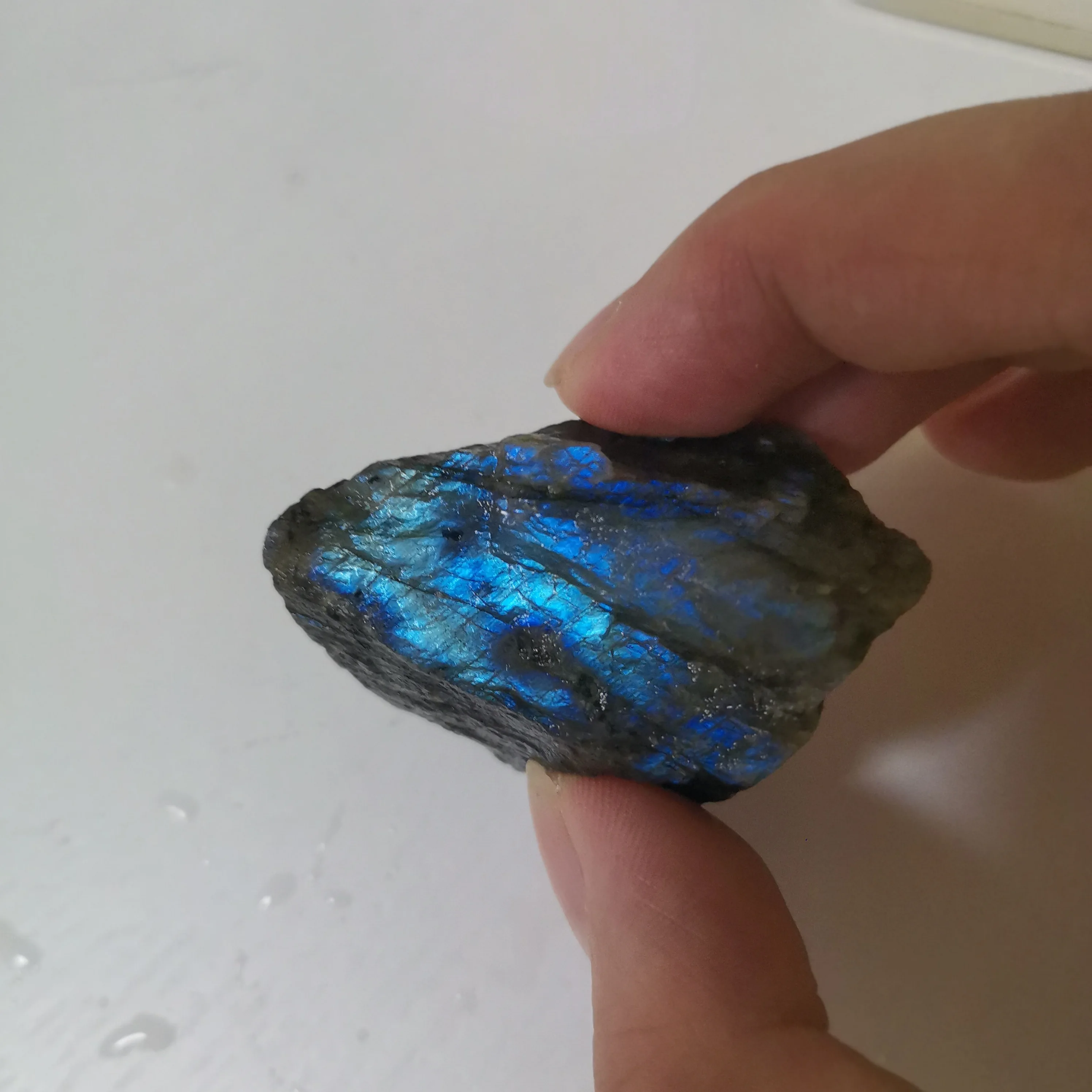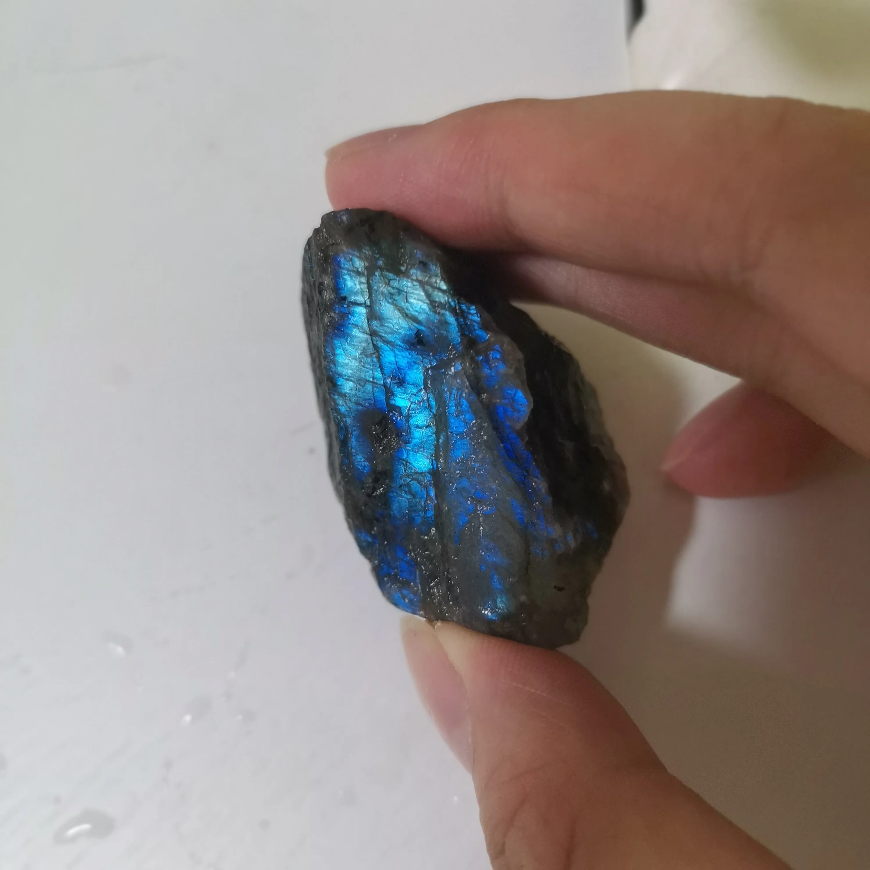 Ponieważ labradoryt jest naturalne surowe kamień, proszę umieścić go w wodzie i znaleźć niebieskie światło. Jeśli nie umieścisz go w wodzie, trudno jest znaleźć niebieskie światło.