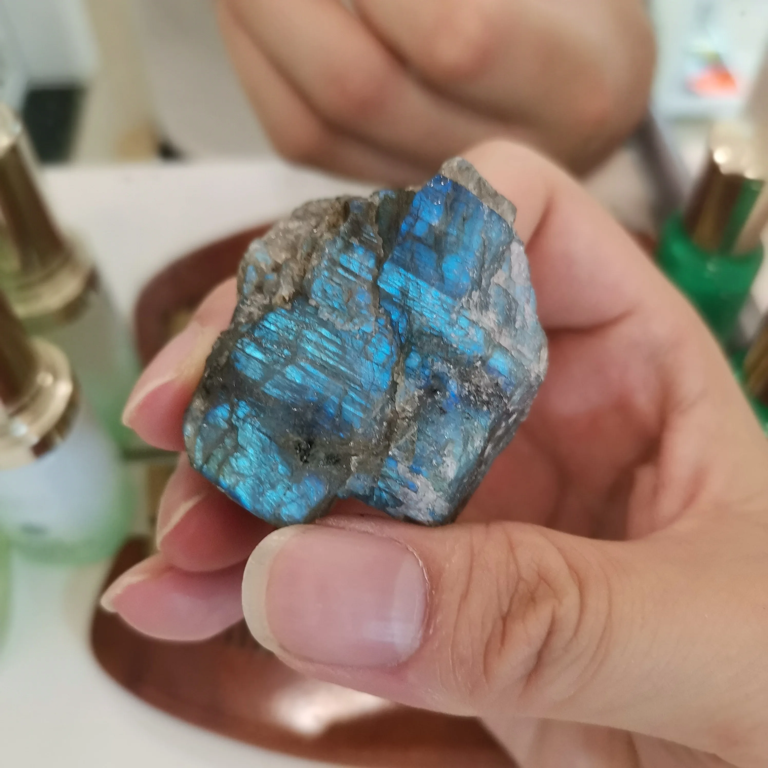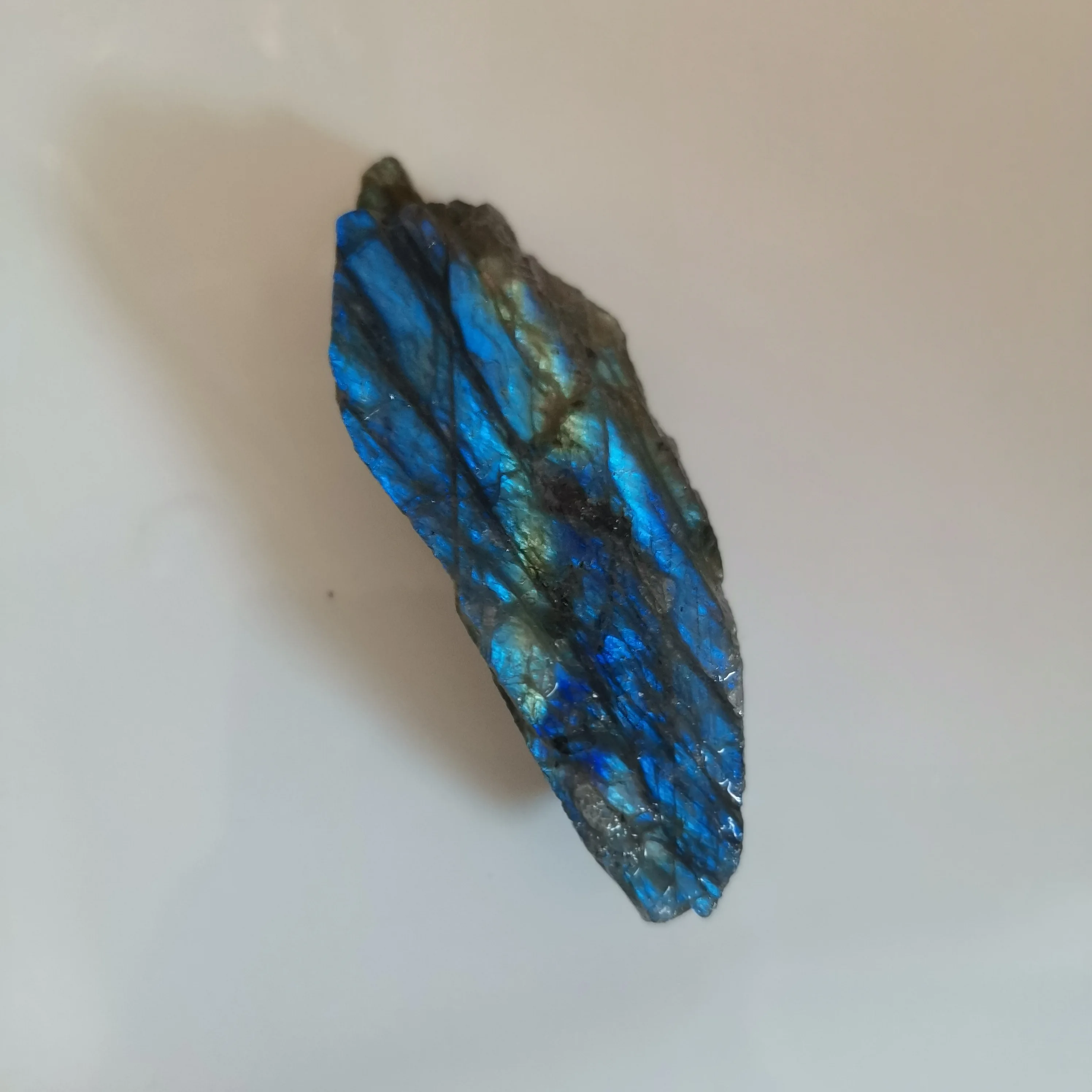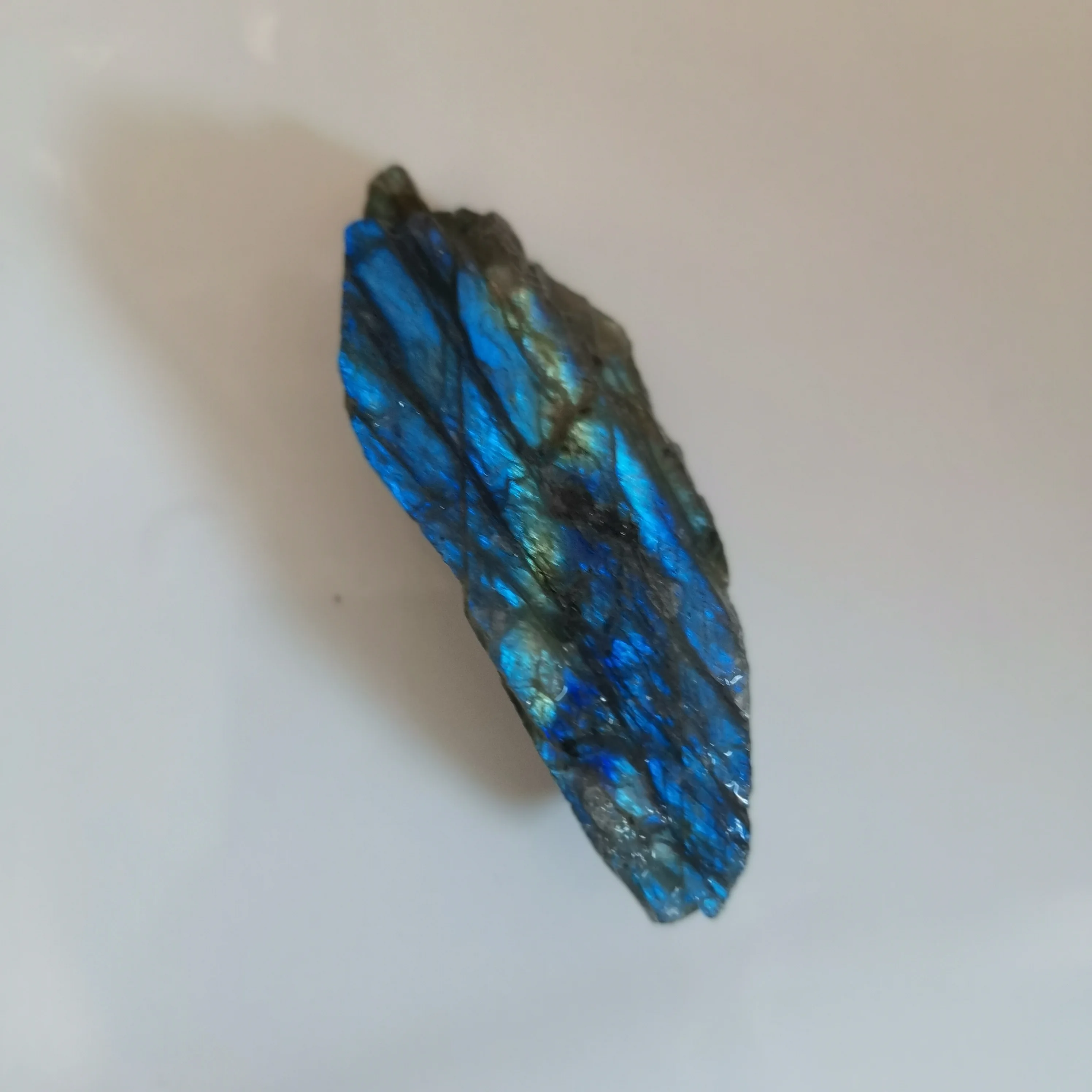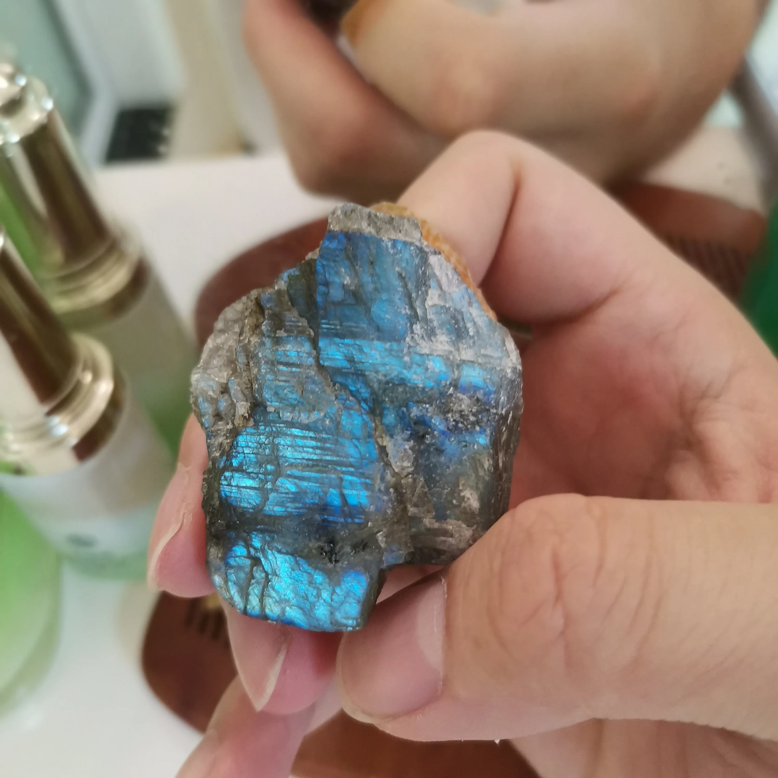 Ponieważ labradoryt jest naturalne surowe kamień, proszę umieścić go w wodzie i znaleźć niebieskie światło. Jeśli nie umieścisz go w wodzie, trudno jest znaleźć niebieskie światło.