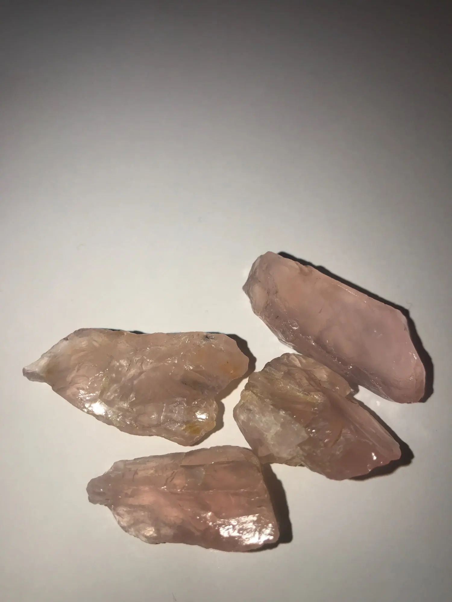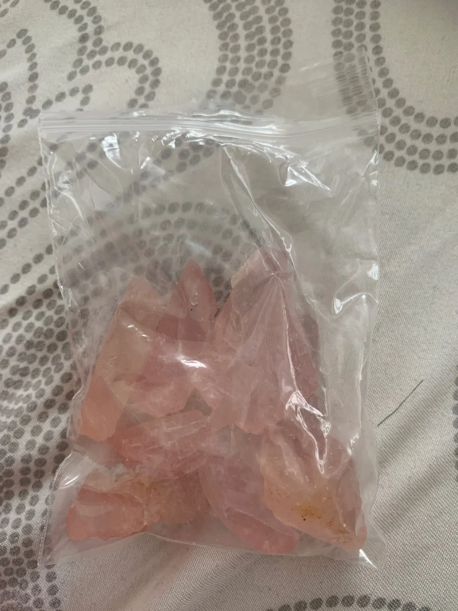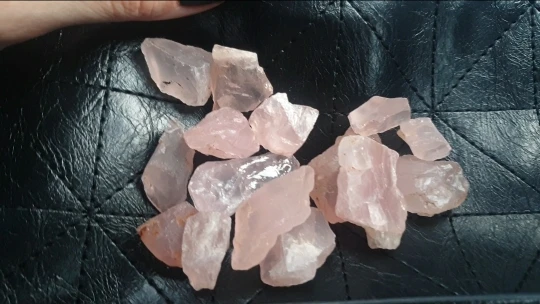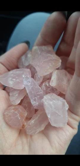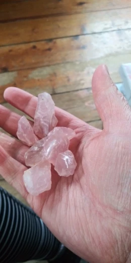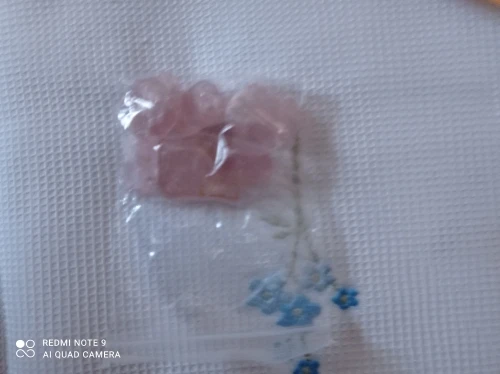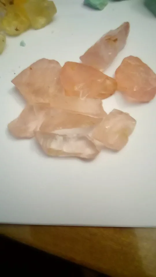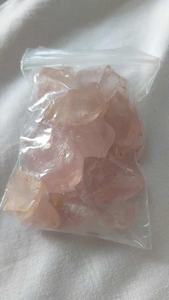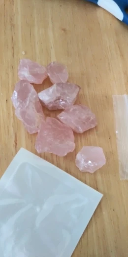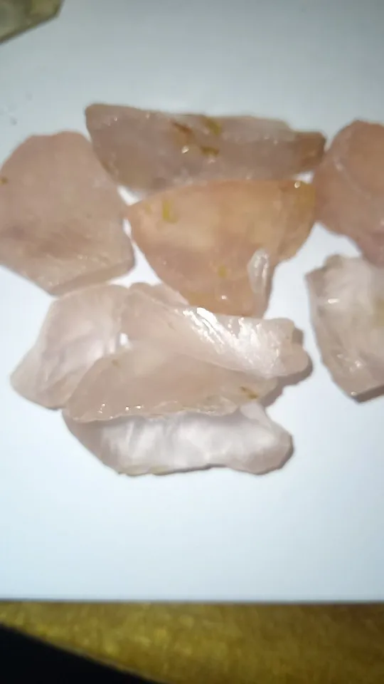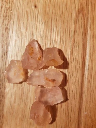 Te różowe kryształki kwarcowe to kamień naturalny z żółtymi zanieczyszczeniami na powierzchni. Jeśli masz coś przeciwko, pomyśl o tym przed zakupem.