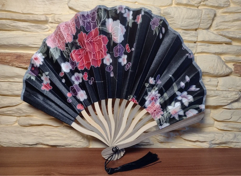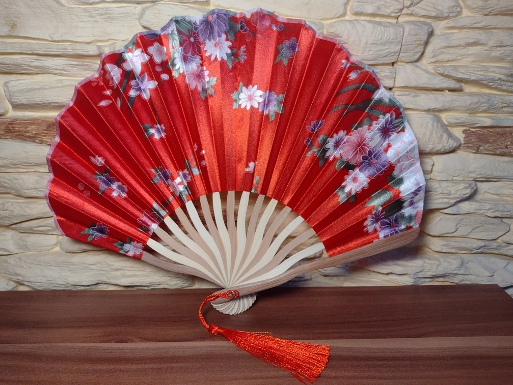 Jest to bardzo piękny, składany wentylator ręczny z bambusa, wykonany z drewna o eleganckim wzorze