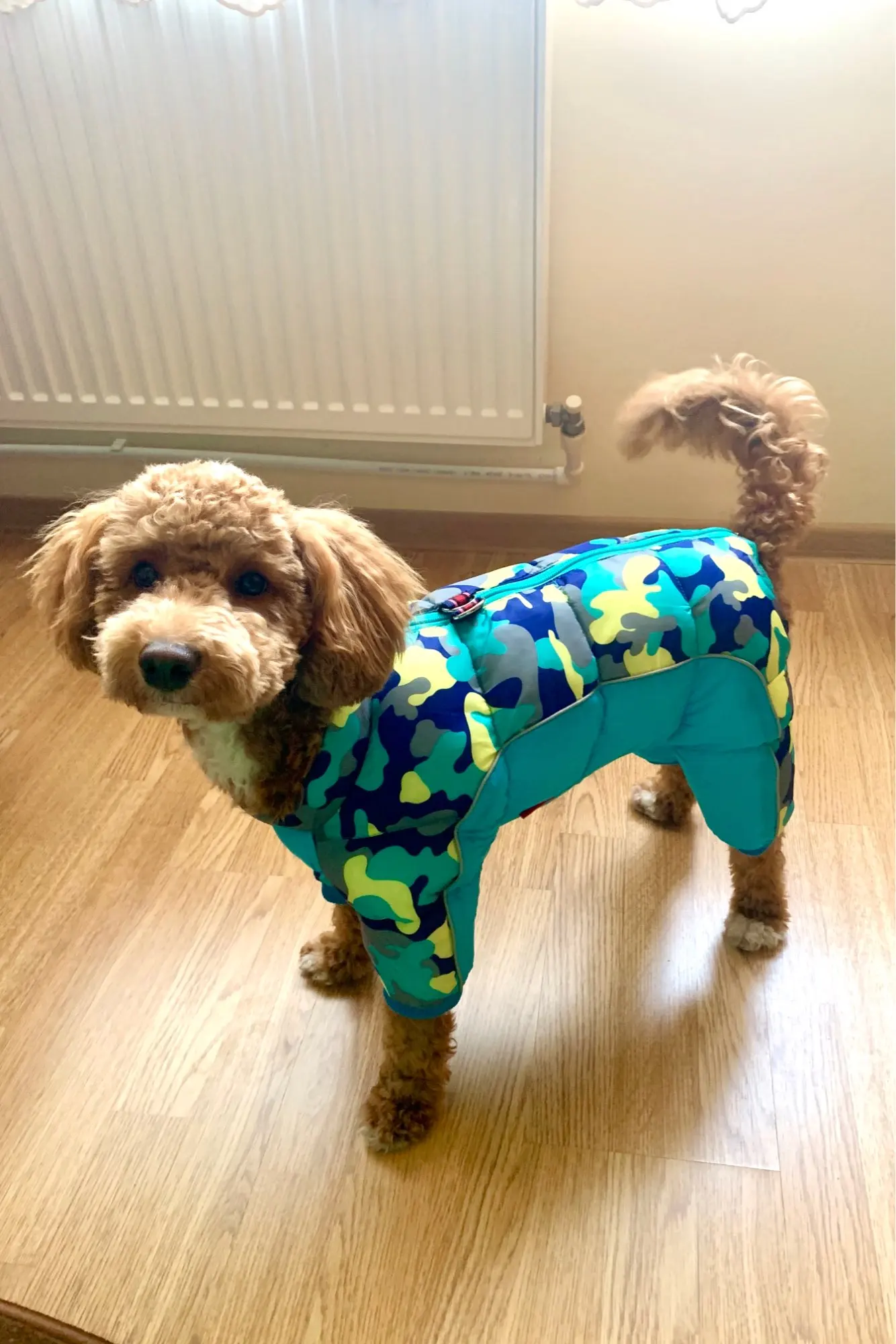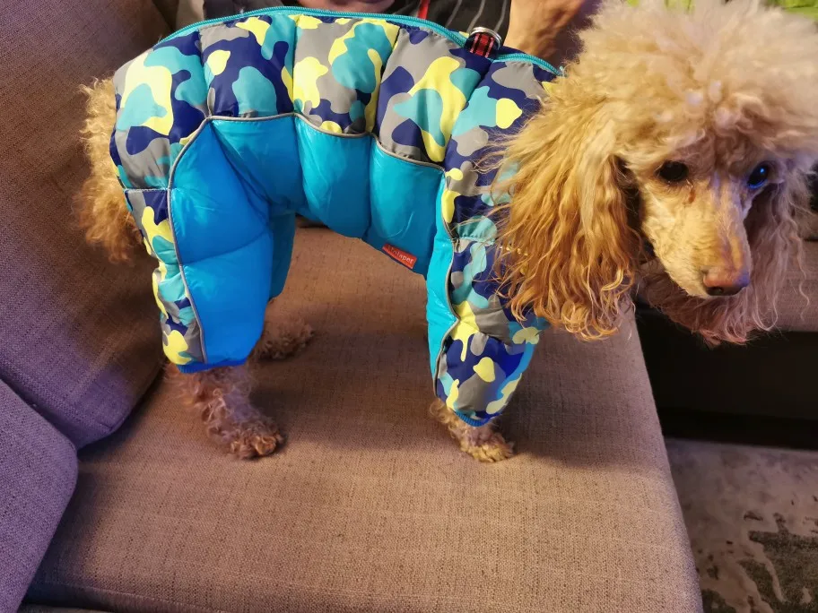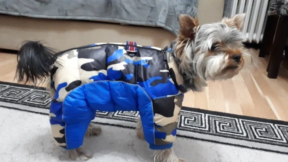 Соответствует размеру. Подойдёт собакам с широкой грудной клеткой. Цвергпинчеру не очень - открыта не только шея, но и часть груди. Сковывает движения, в отличие от подобной модели с "голой попой и писюном". Собакам-тюленям, спокойно гуляющим во всём, во что их одевает хозяин, подойдёт. Комбинезон пухленький, производит впечатление довольно теплого. Думаю, мопсам и бульдогам будет в самый раз.