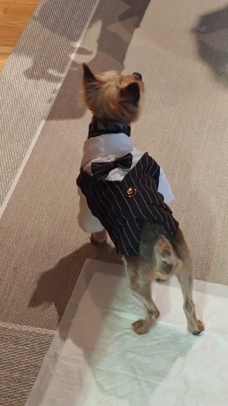 Słodki Yorkshire Terrier uczęszcza na wesele mamy