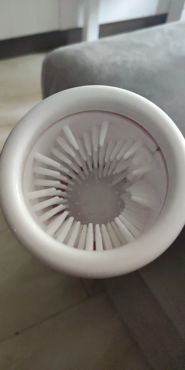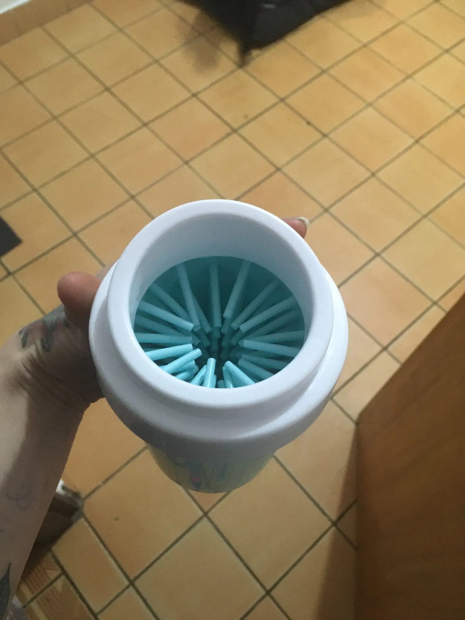 es como en la foto, no es muuuy alta, pero si coge la patita de un perro pequeño/mediano, yo cogí el tamaño L y esta bien para mi perrita de 12'5kg. Tienes que añadir un poco de agua con jabón para que haga su efecto, pero gira bien