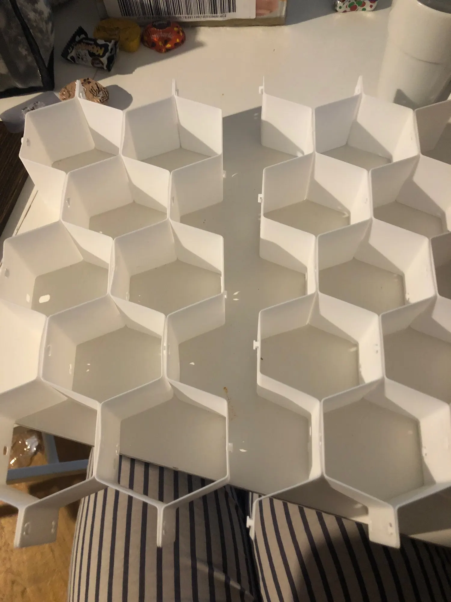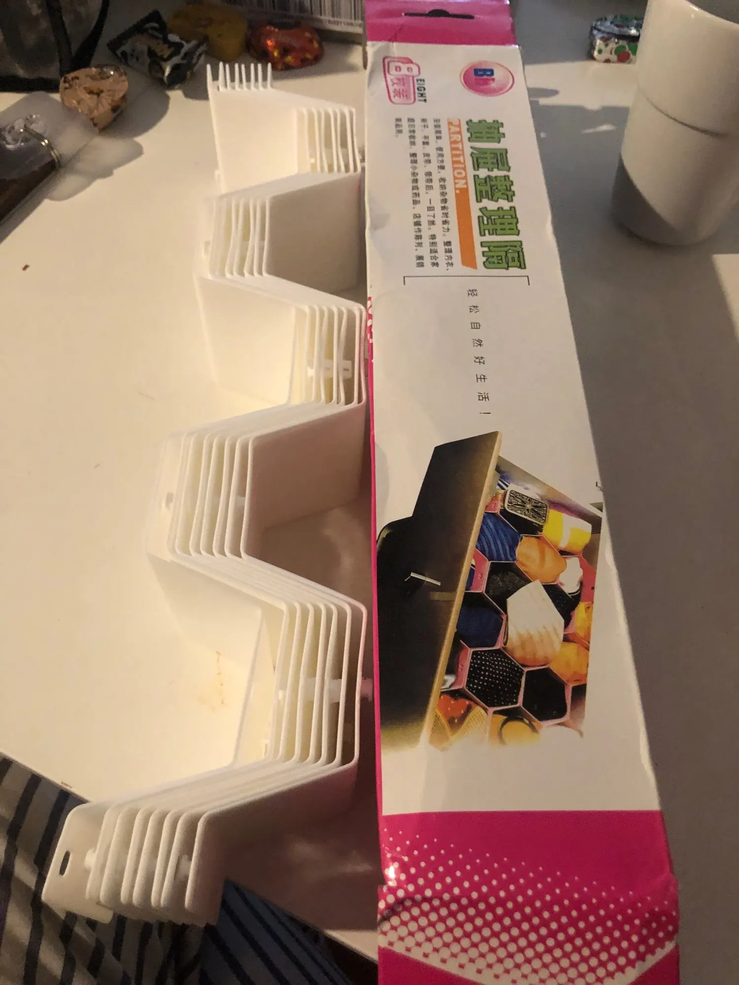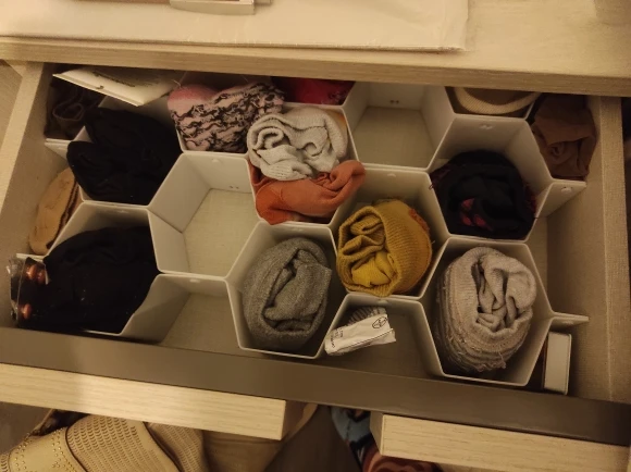 Its actually easier to figure out than I thought. You can make either an open pattern or a closed pattern with one small change and one box brings 8 pieces which is enough for either one bog drawer or 2 normal ones. Each hexagon fits 1 pair of socks or 2 undies, also I am thinking about using it for nail polish. Very satisfied!