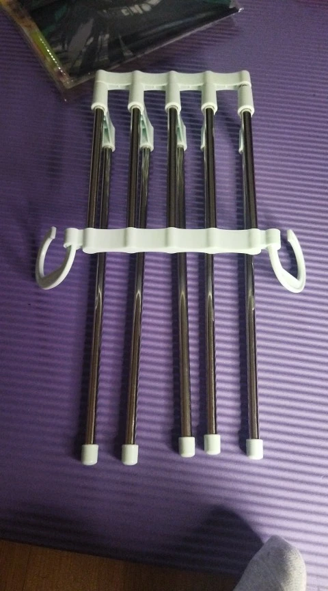 5 w 1 konstrukcja sprawia, że spodnie czysty i schludny, oszczędzając więcej miejsca. Na górze są dwa haczyki. Możesz użyć dwóch haczyków do poziomego zawieszenia lub po prostu użyć haczyków do pionowego zawieszenia. Stosuje się pięć rury ze stali nierdzewnej, z których każdy można wyciągnąć na zewnątrz, aby ułatwić zawieszenie i recykling. Może być również stosowany jako spinacze do prania. Wykonany z wysokiej jakości stali nierdzewnej, jest trwały i łatwy do przenoszenia. 5 w 1 konstrukcja sprawia, że spodnie czysty i schludny, oszczędzając więcej miejsca.