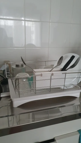 2, funkcjonalny projekt-mieści do 8 talerzy i zawiera wyjmowany 2-komorowy plastikowy stojak na przybory, może drenować i wysychać naczynia takie jak kubki, kubki, I może również spuścić warzywa i owoce do kosza.
