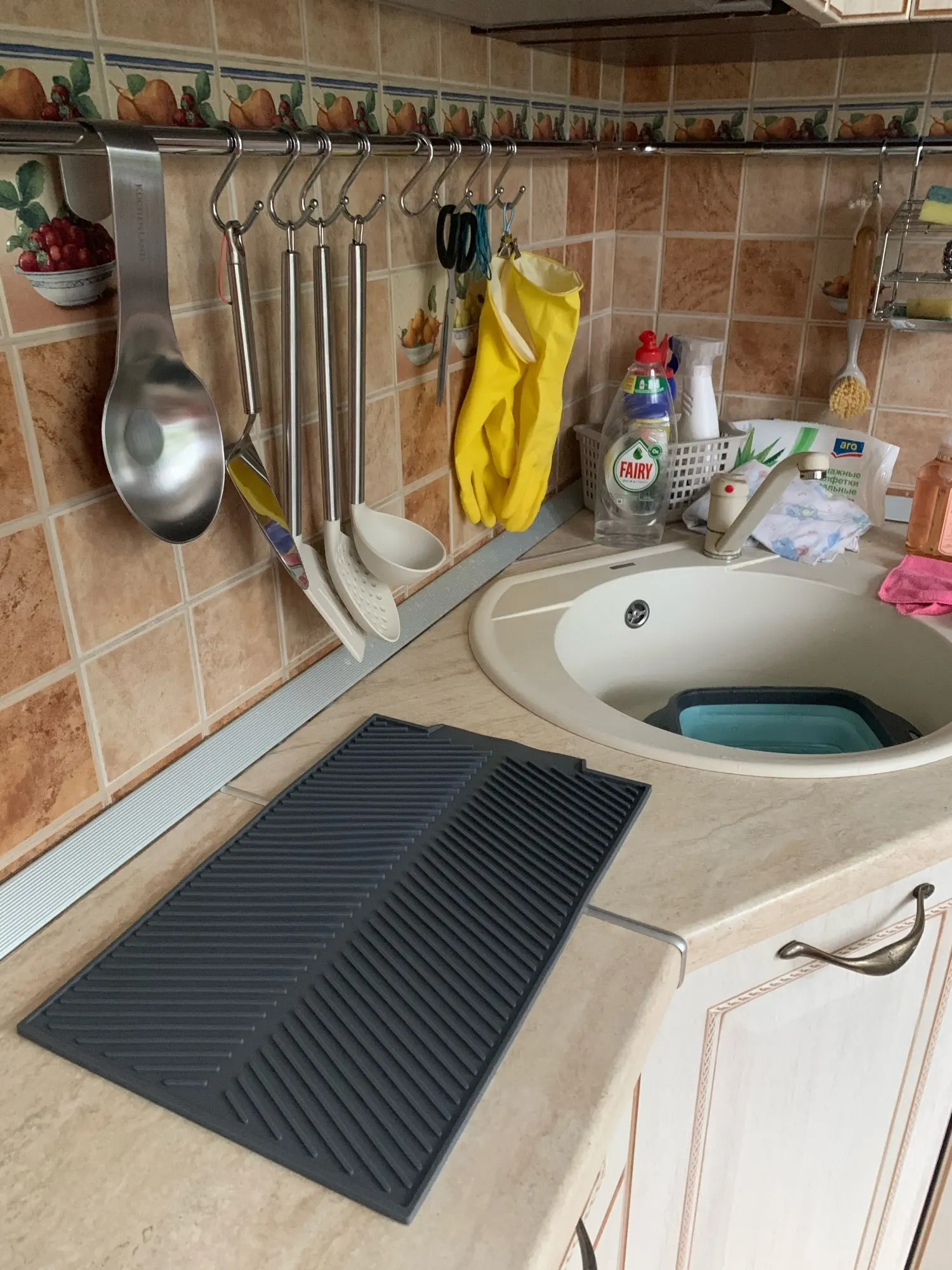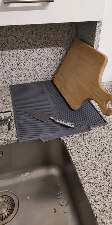 Cet égouttoir est vraiment très pratique. Il arrive souvent que je n'aie pas assez de place sur l'égouttoir à vaisselle. Il est enroulé à proximité. Hop, je le pose sur une table et je dépose la vaisselle. La conception du produit empêche l'eau de couler sur la table. Je recommande le produit et le vendeur.