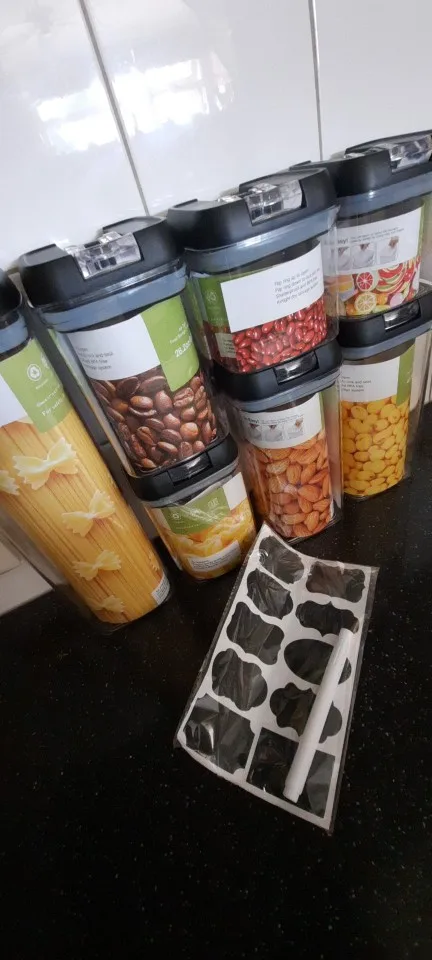 foto gelijk aan het product! incl. stickers en stift! deksels sluiten goed en zitten stevig dicht! prima tevreden!