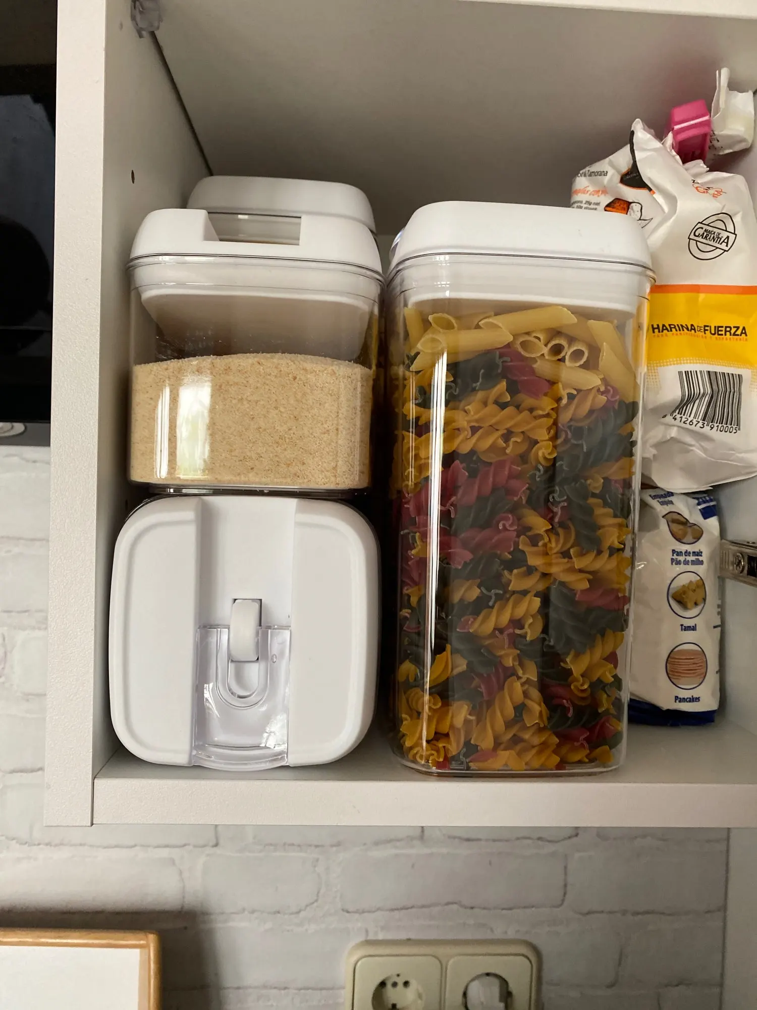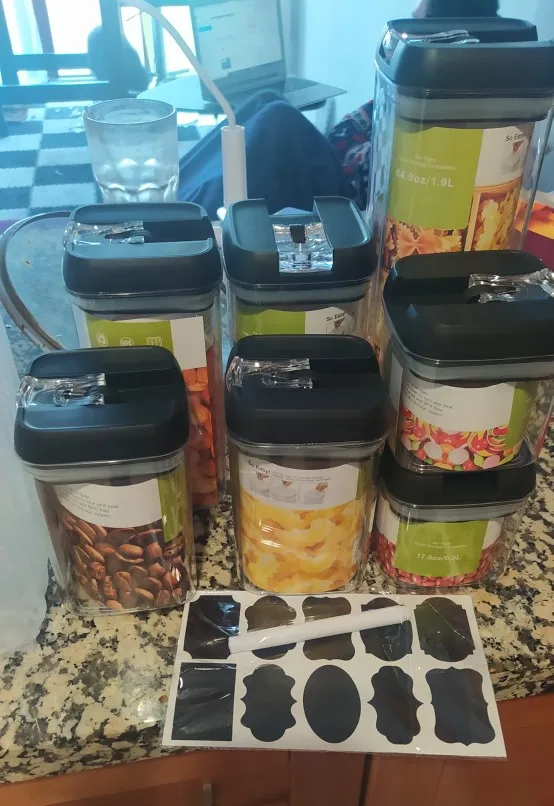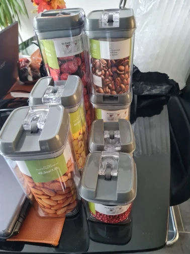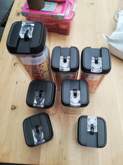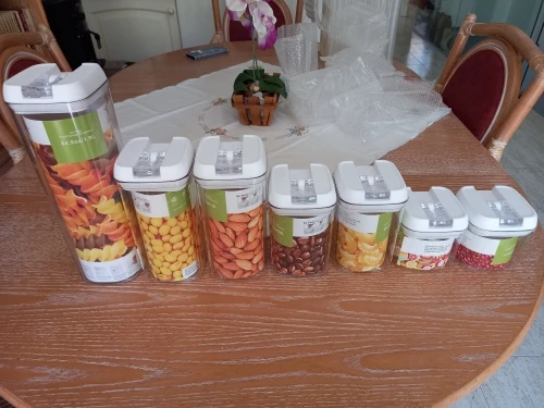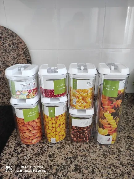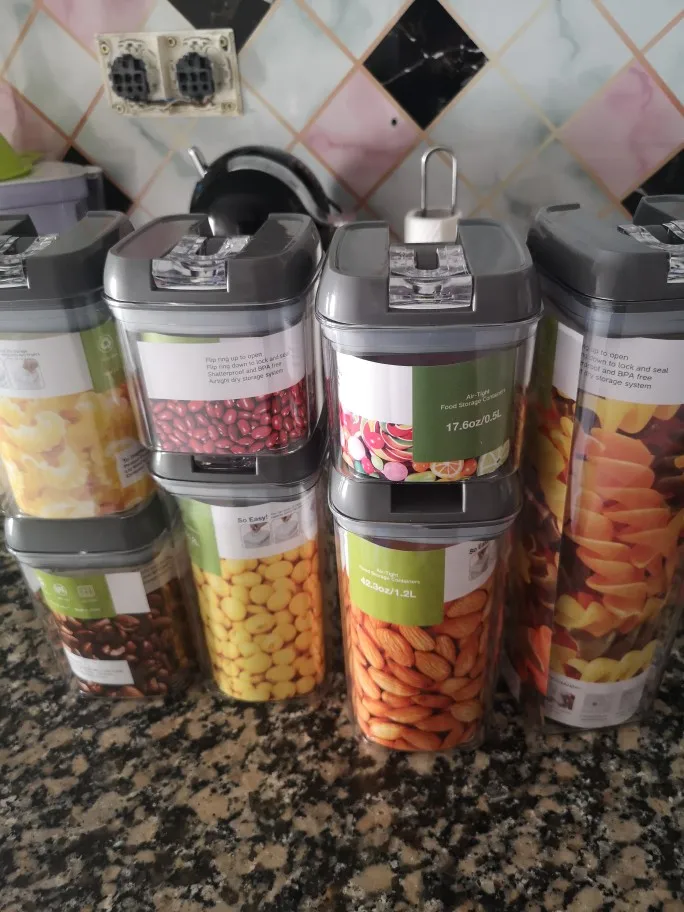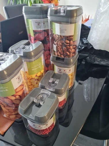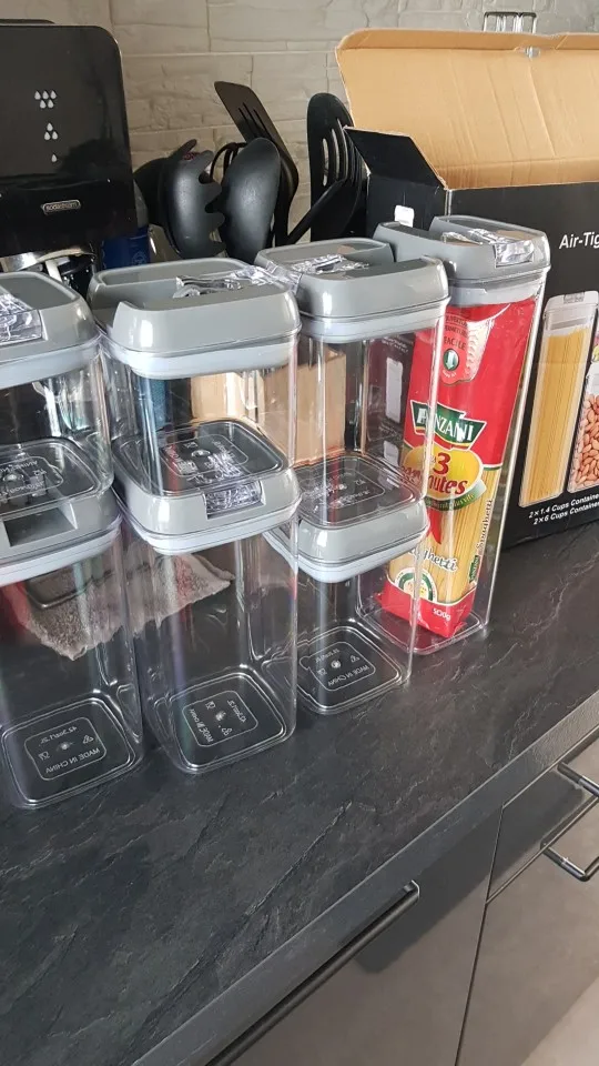 Jeden zestaw pojemniki-Wysoki pojemnik (1,7 qt), średnie pojemniki (1,1 qt), małe pojemniki (0,7 qt), Mini pojemniki (0,5 qt). Idealny do przechowywania mąki, cukru, ryżu, ziarna, orzechów, fasoli, przekąsek, makaronu, kawy i herbaty!