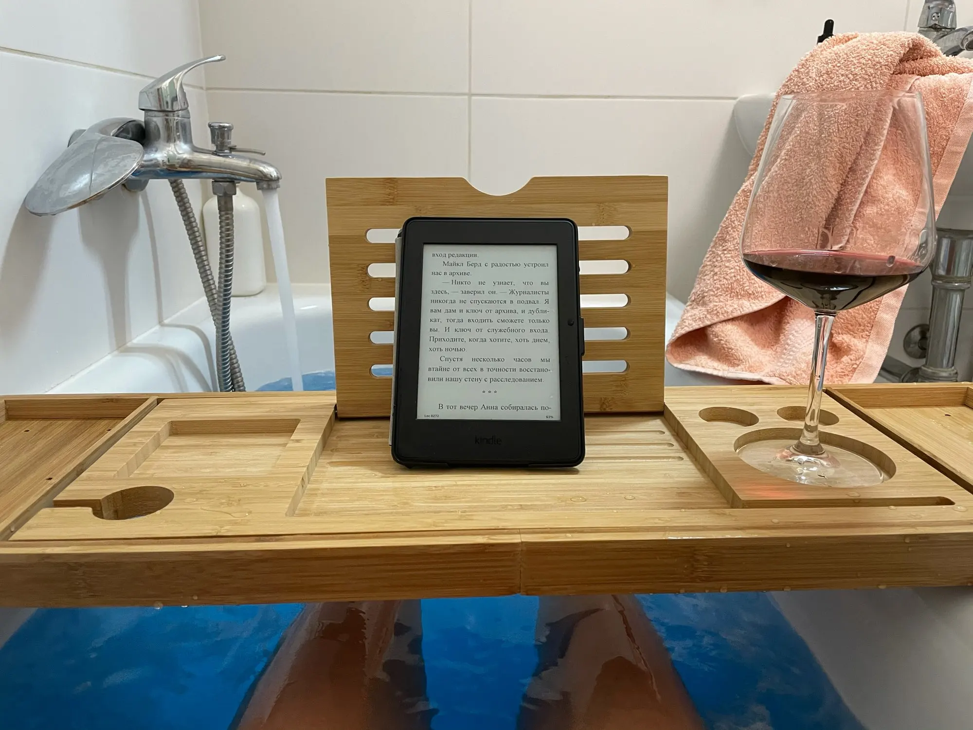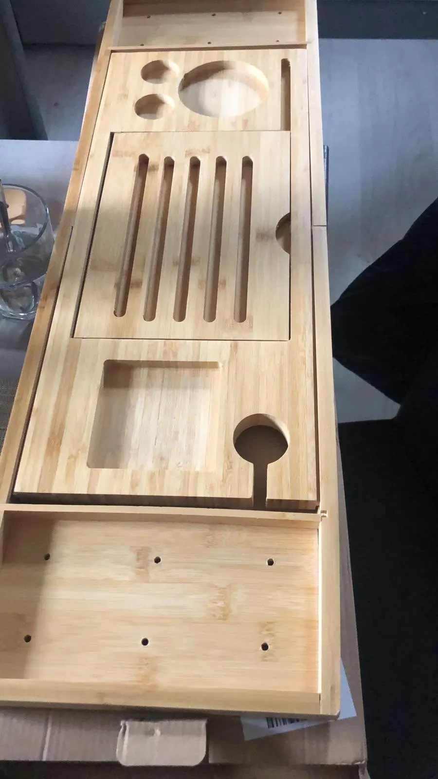 [Pojemne]Taca caddy z trzema dodatkowymi gniazdami do przechowywania telefonu, lampka do wina i butelka wina. Dwie ruchome półki mogą pomieścić książki, kubek, świece, ręcznik itp.