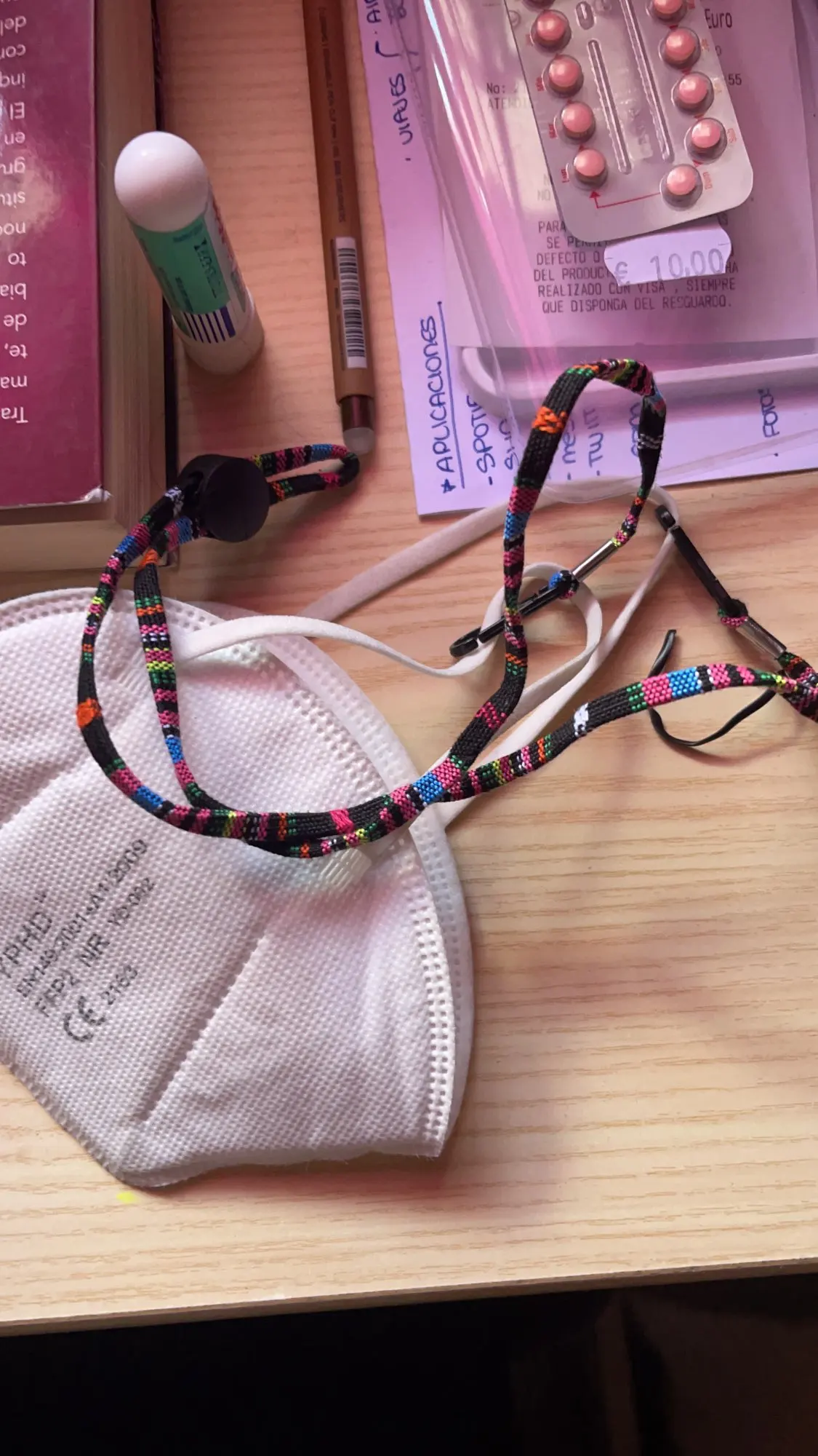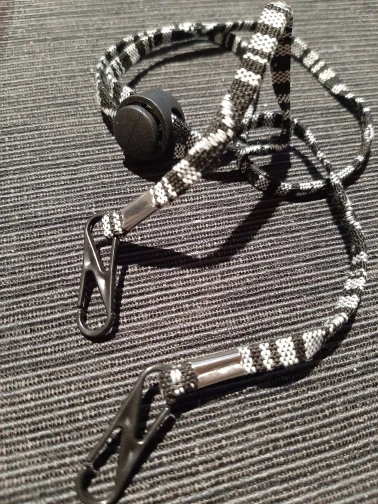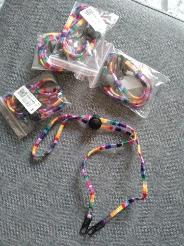 Dokładnie to, czego potrzebujesz dla niezbędnych pracowników-przypnij małe haczyki do opaski elastyczne na masce. Jak uchwyt do okularów, po prostu wsuń go na głowę i noś jak naszyjnik. Będzie działać z istniejącym wygaszaczem uszu lub opaską na głowę
