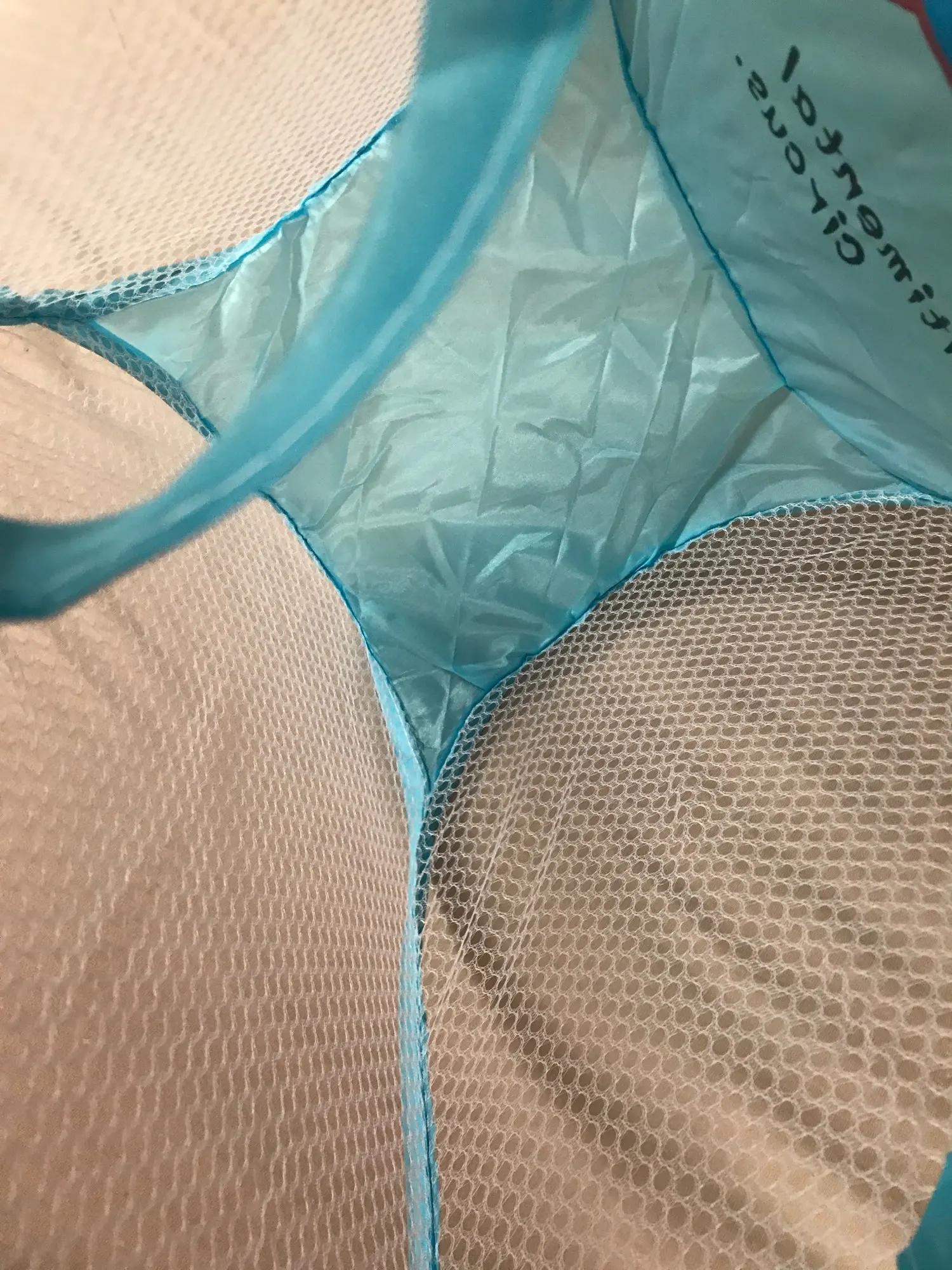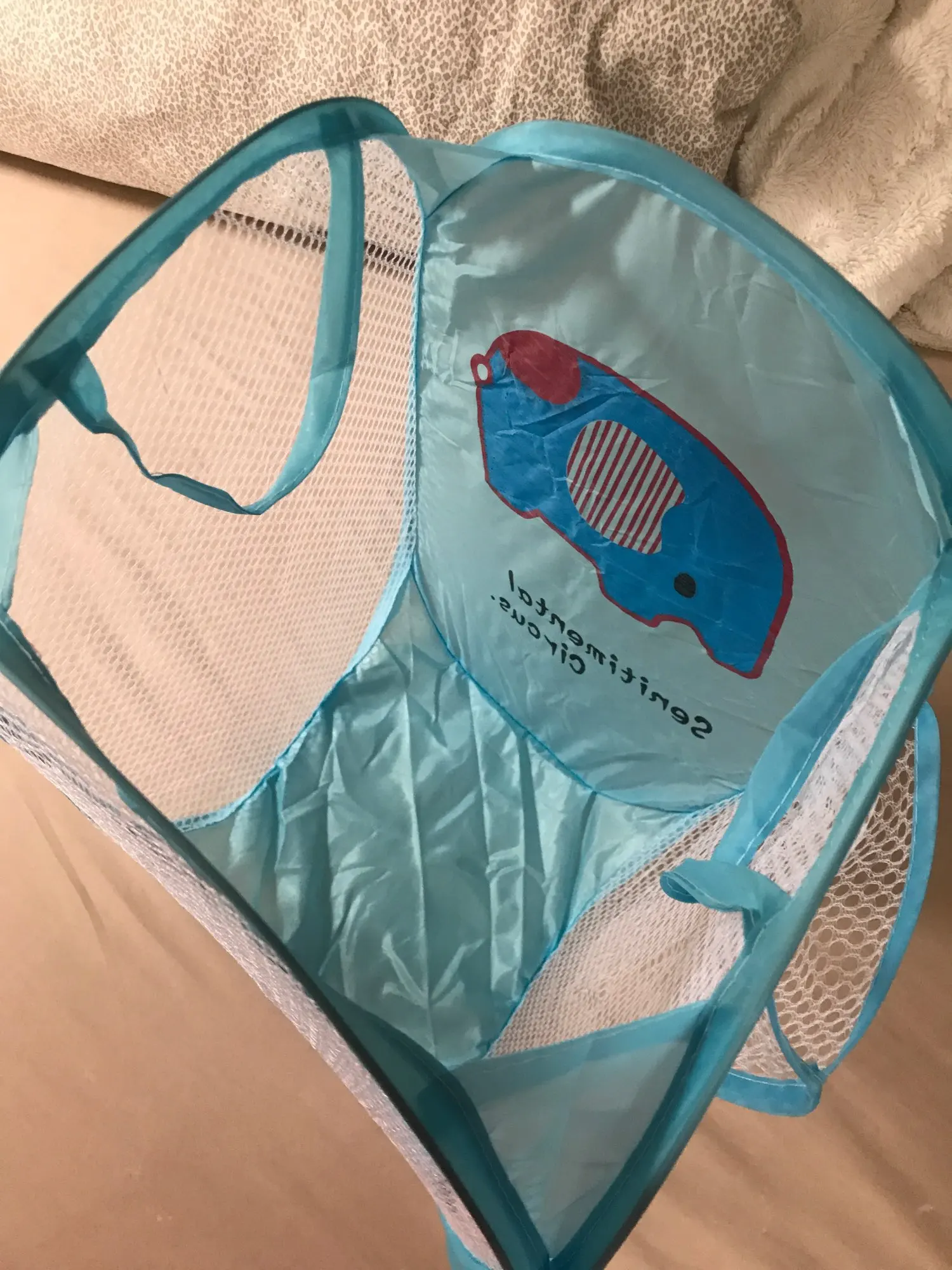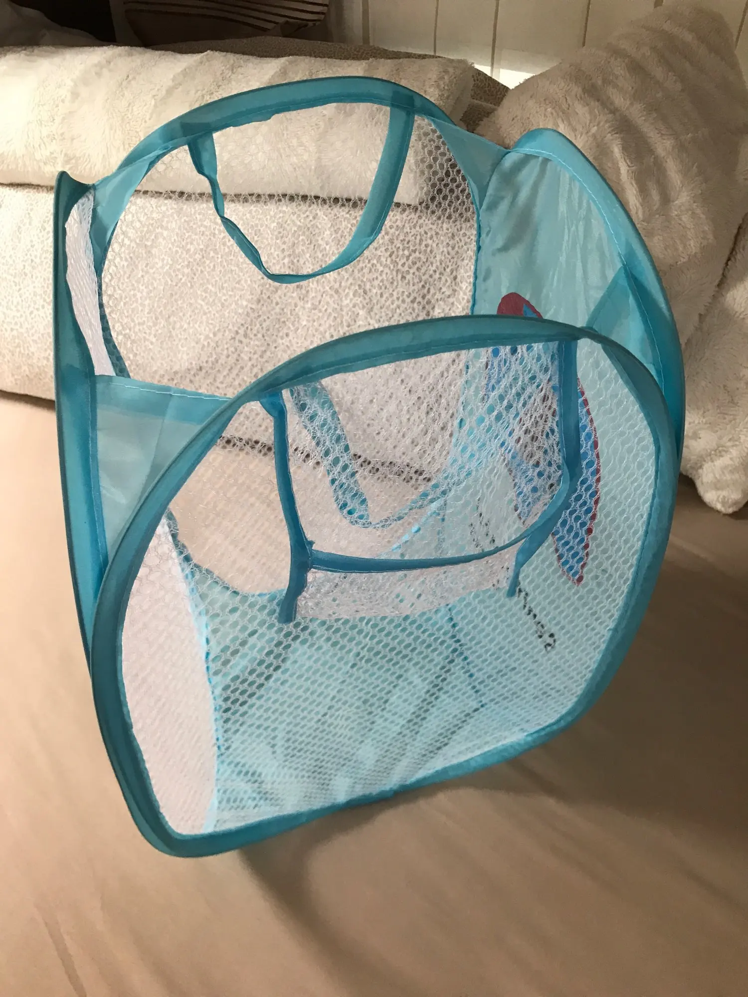 Po jednej stronie brudnego kosza znajduje się mała torba siatkowa, którą można wykorzystać do przechowywania małych przedmiotów, takich jak skarpetki.