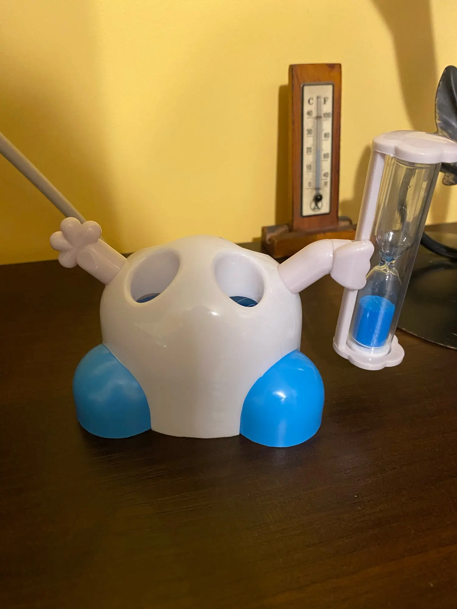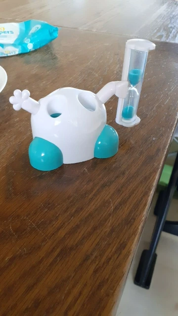 wat een leuk tandenborstel poppetje. en zo super handig dat je de zandloper nu niet meer kwijt raakt.