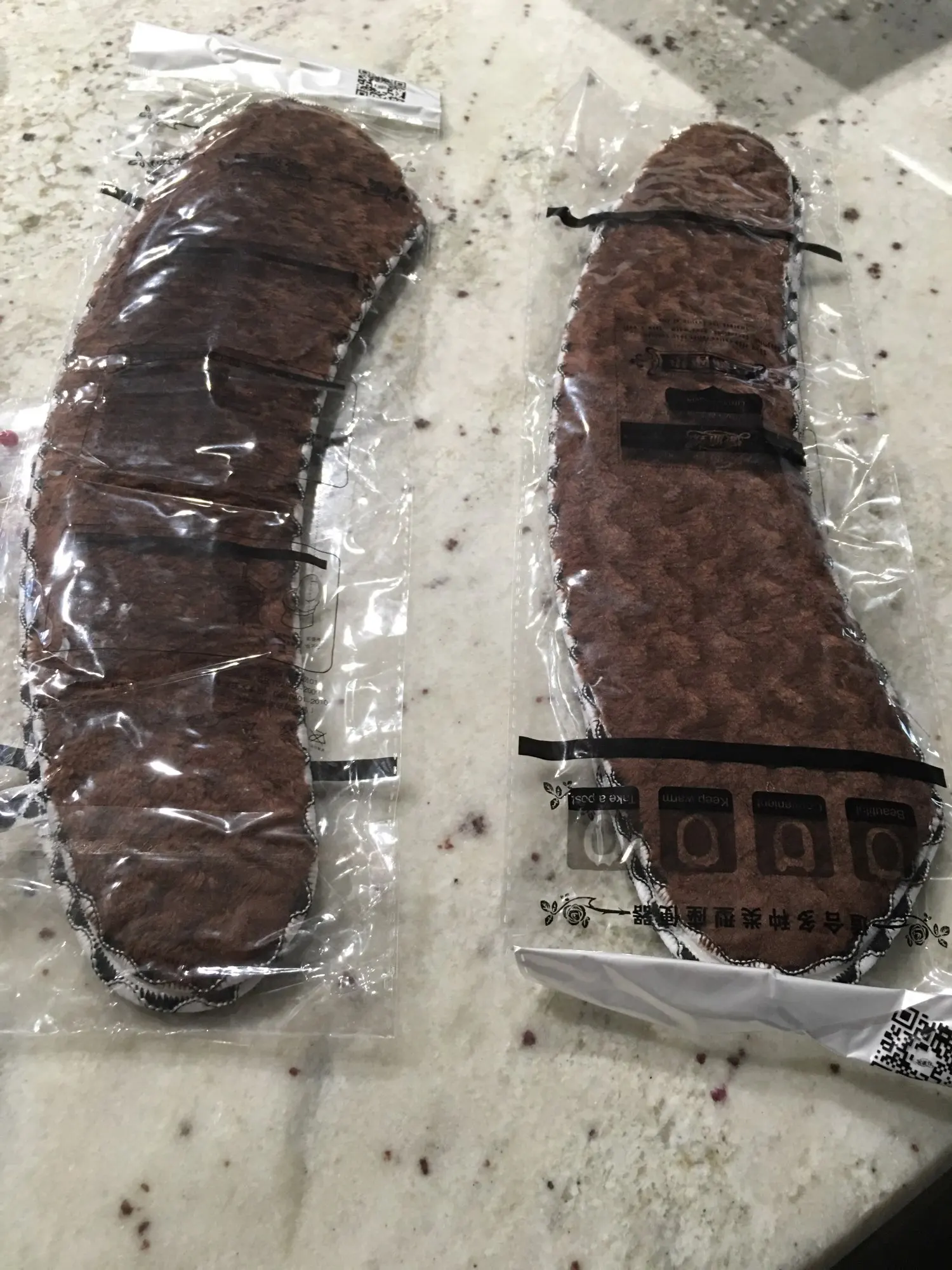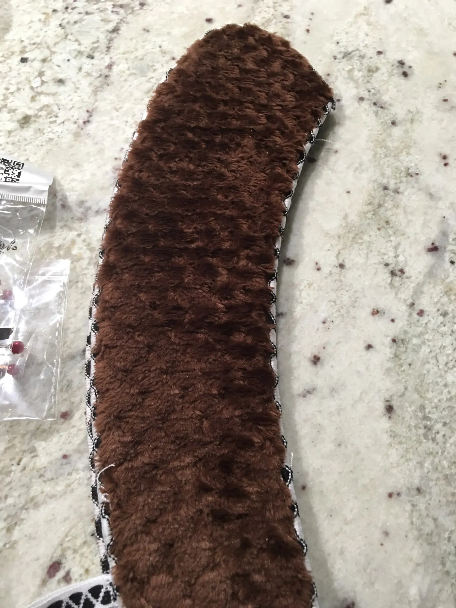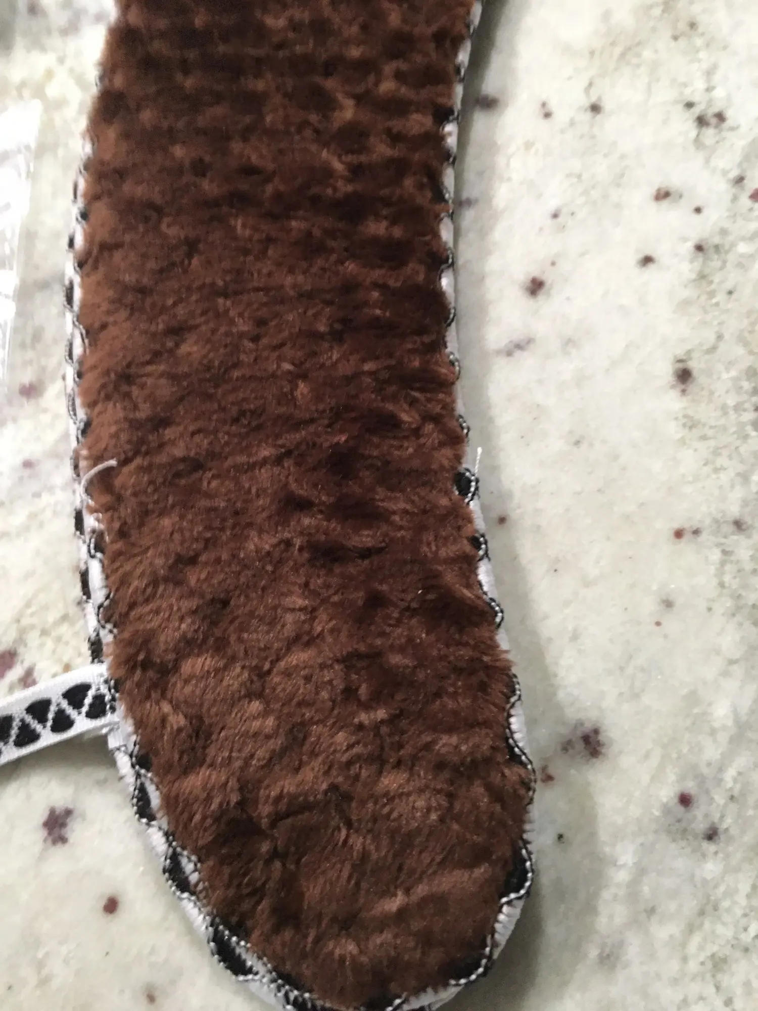 Es tal y como se muestra en las fotos de anuncio. El material es fieltro, pero NO es nada grueso. A mi me da igual porque lo que buscaba era no helarme las piernas.