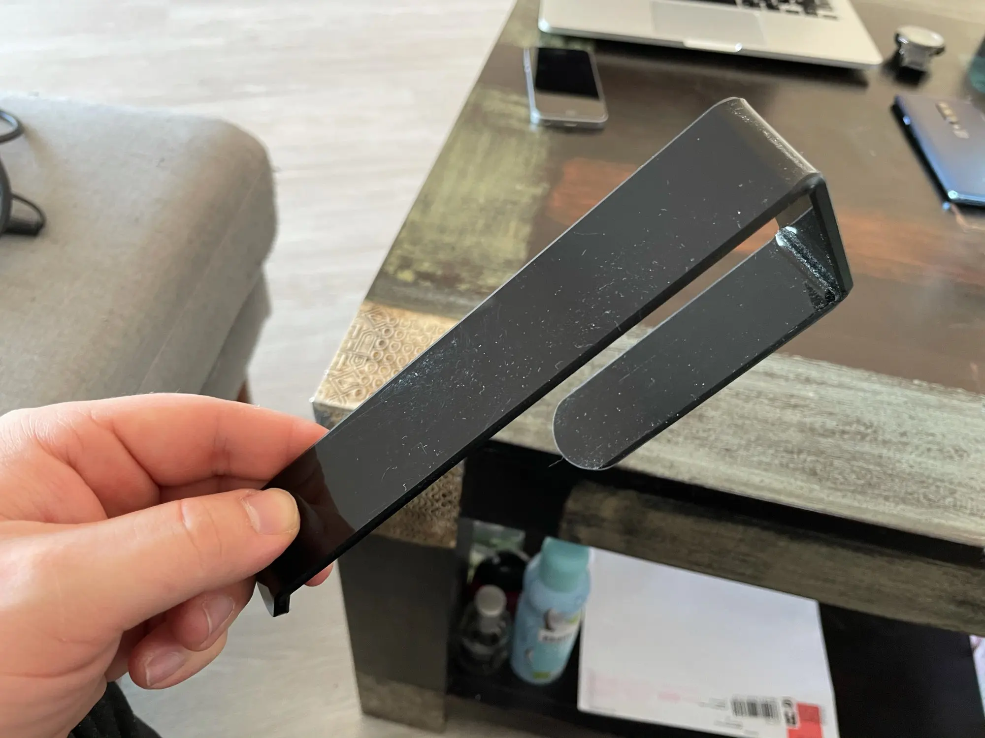 Bardzo fajny uchwyt. jest plastikowy. jedynie juz po kilku dniach po zawieszeniu tasmq ciut sie odkleja, moze to moja wina bo przecielam ta tasme na pol i rozlozylam po bokach. wiec po jakims czasie musze zmienic na inna ;)
