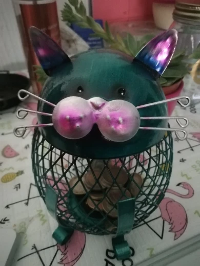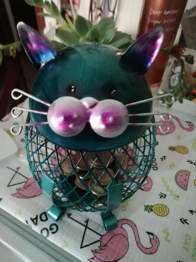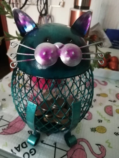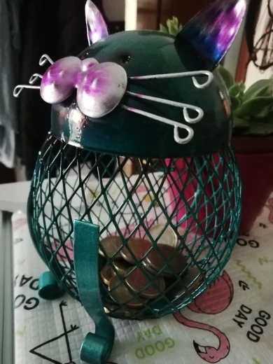 Jest to piękne i niesamowite pudełko na monety w kształcie kota. Ma ładny wygląd i wygląda tak uroczo. Ciało kota wykonane jest z siatkowej siatki żelaznej, pozwala zobaczyć, że fortuna wzrasta bezpośrednio i poczuć radość oszczędzania pieniędzy. Bez względu na to, czy umieścisz go na biurku, czy wejściu, stworzy artystyczną atmosferę do twojego domu.