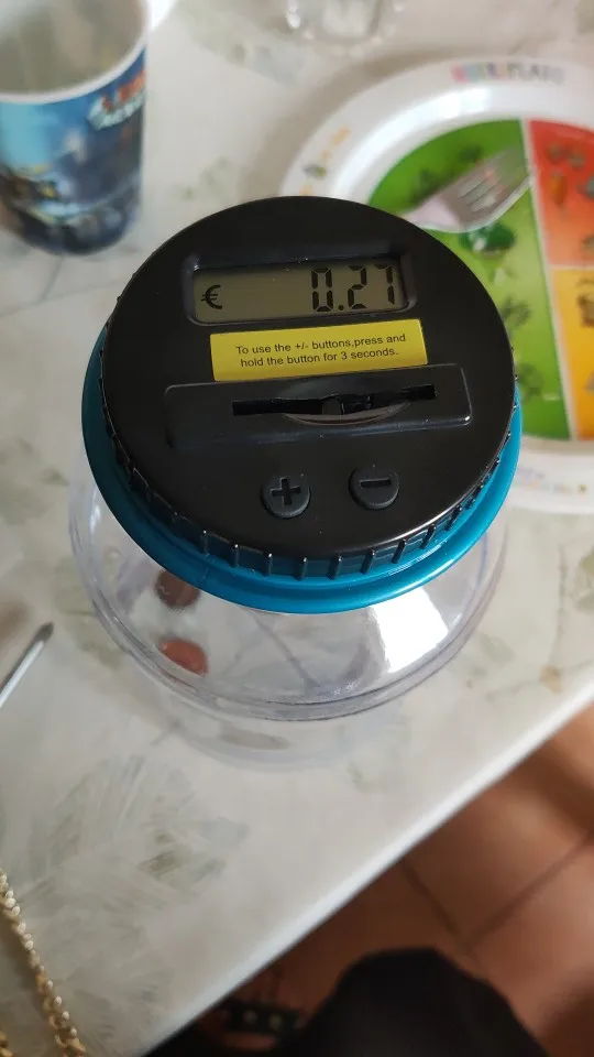 Wystarczy wsunąć monety, a cyfrowy licznik monet działa za ciebie! Łatwe skręcanie, zdejmowanie pokrywy dla twojej wygody! Dwa małe rowki na korpusie słoika ułatwiają trzymanie go. Zawiera również przyciski +/-na pokrywie, aby umożliwić ręczne. Szerokie wąskie gardło, aby wygodnie wyjąć monety.