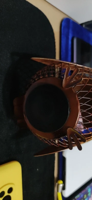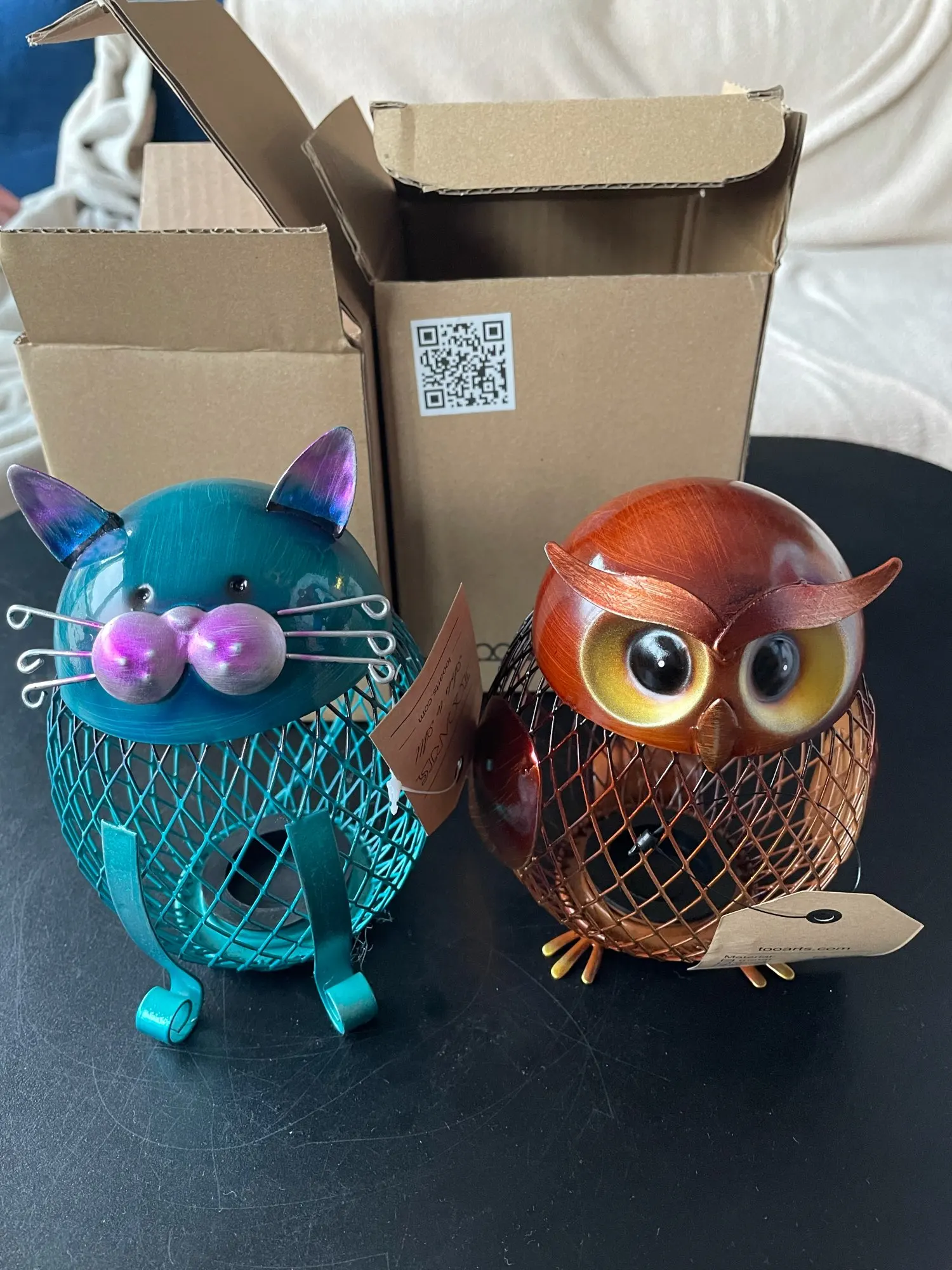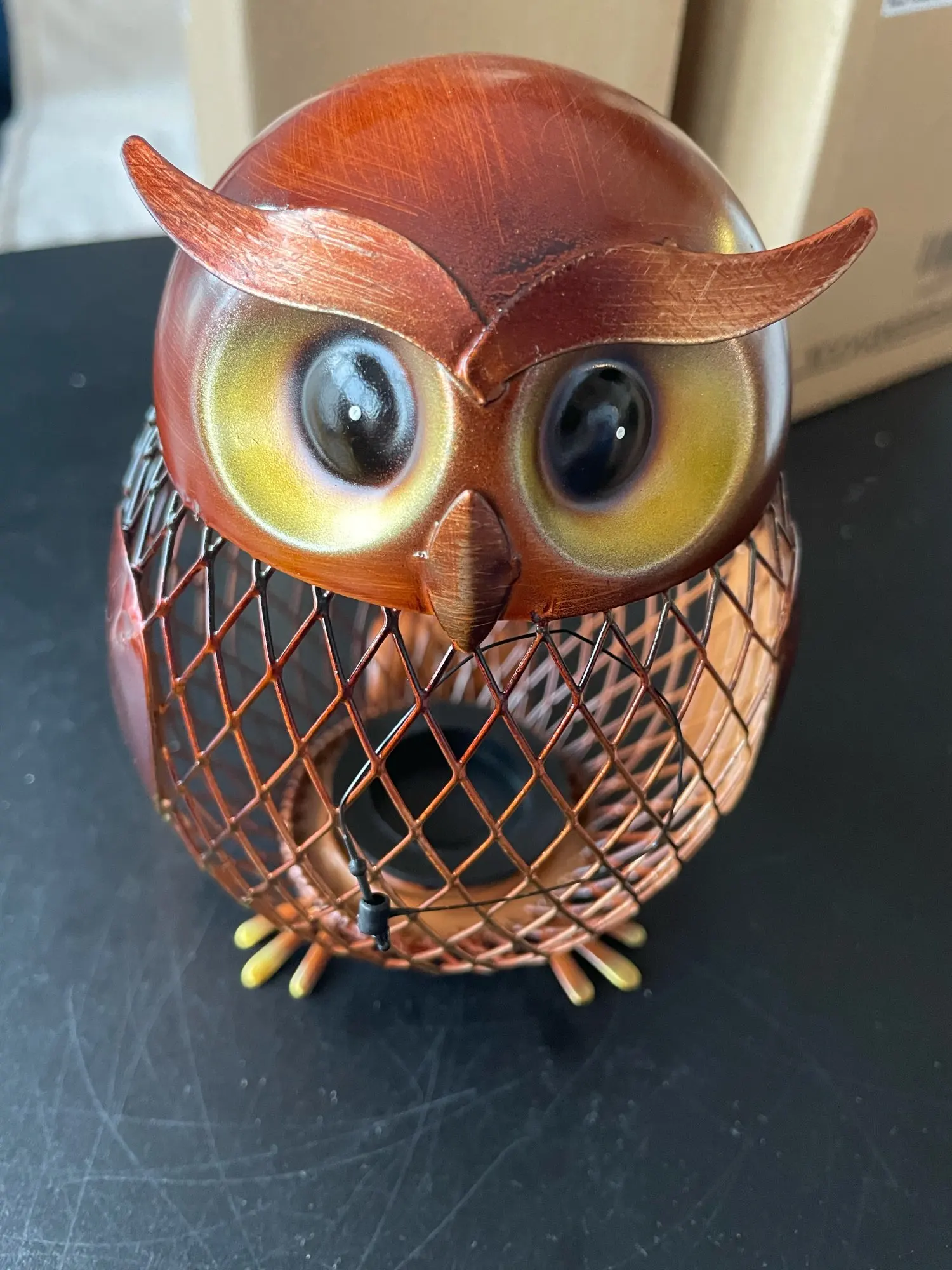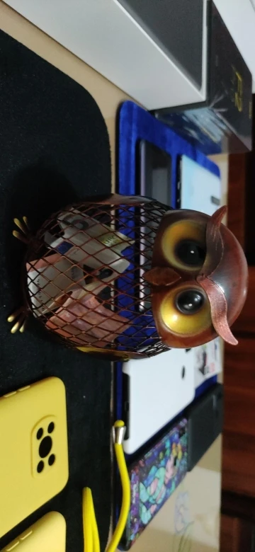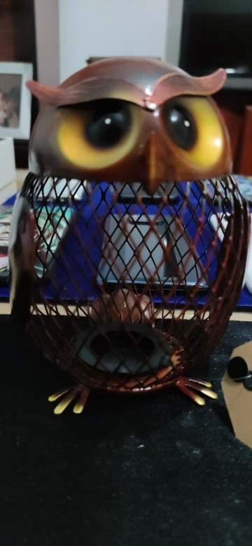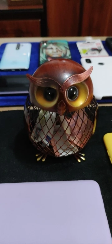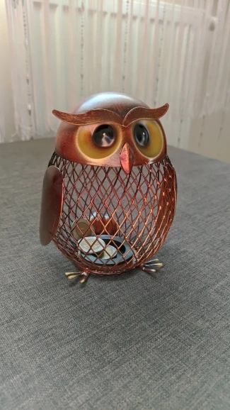 Jest to ręcznie robiona metalowa rzeźba w kształcie sowy. Środowiskowa farba utrzymuje ją nierdzewną, kształt siatki spełnił produkt z poczuciem nowoczesnego designu. Może być używany do przechowywania monet lub małych zmian. Praktyczny i artystyczny, wygląda uroczo naiwnie.