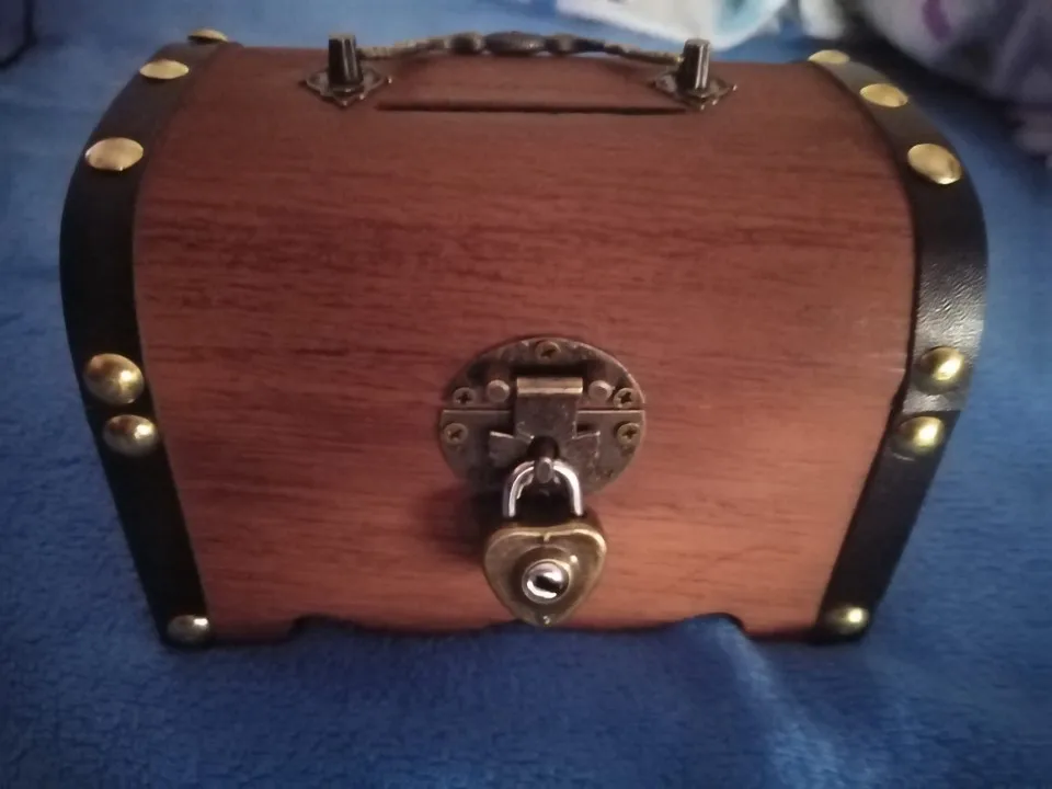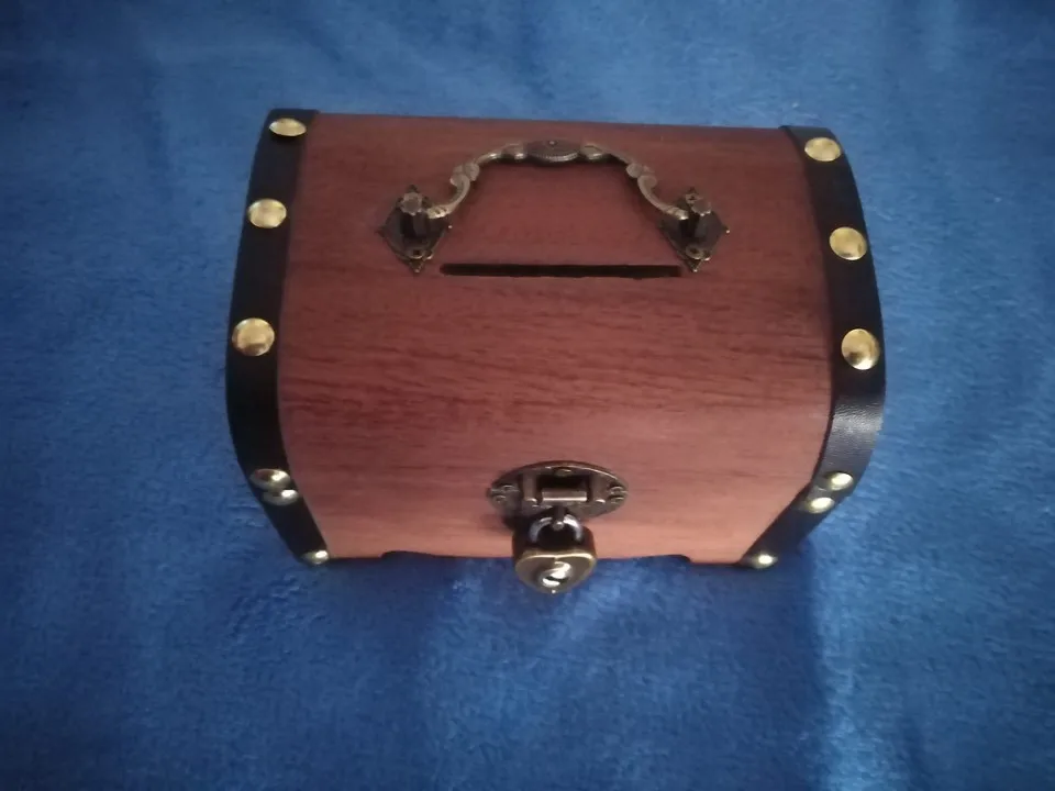 To jest archiwalne skarbonka skarbów. Wykonany z najwyższej jakości drewna i wykwintne wykonanie, ta skarbonka jest klasyczna i retro. Może to być skarbonka, a także delikatna ozdoba do domu, biura itp. konstrukcja zamka, bezpieczniejsza i wygodniejsza w użyciu. Ta skrzynia skarbów idealnie nadaje się na święto dziękczynienia, urodziny, wesela i prezenty na rocznicę.
