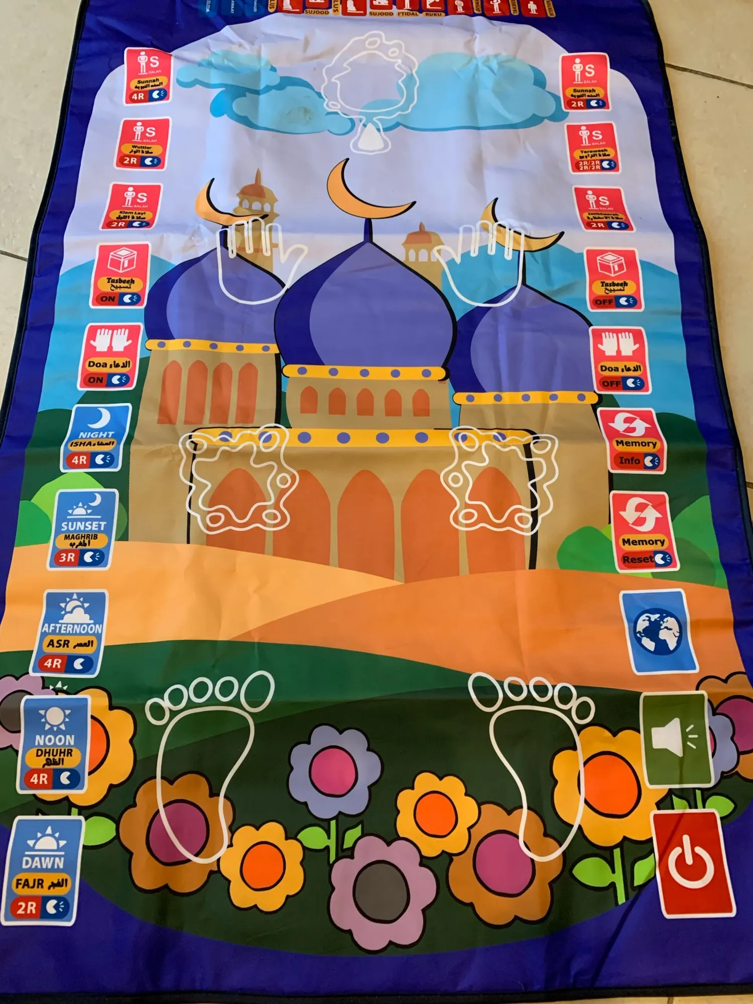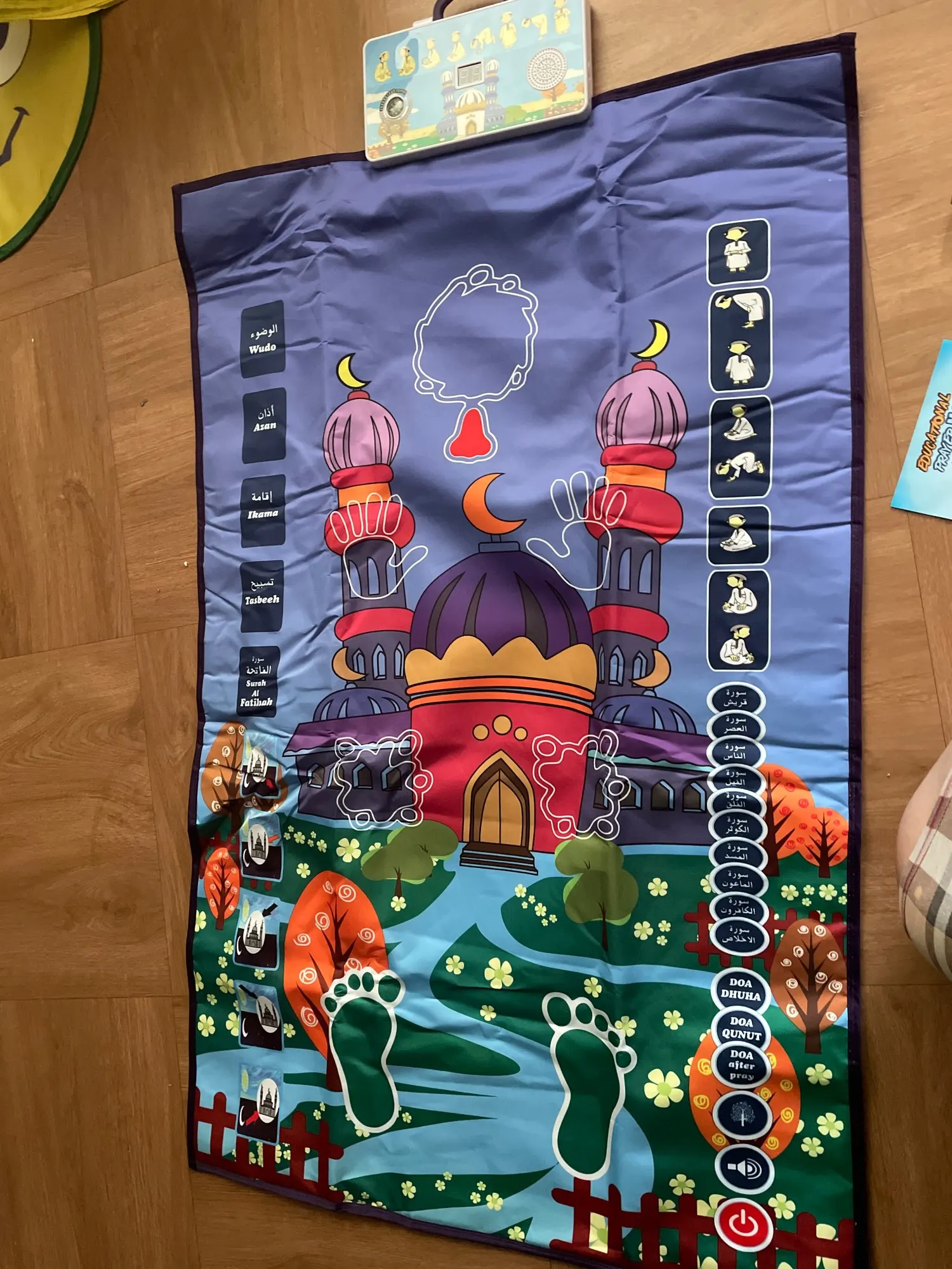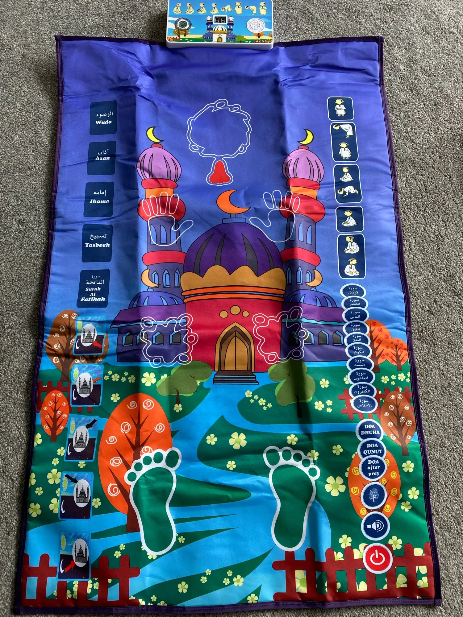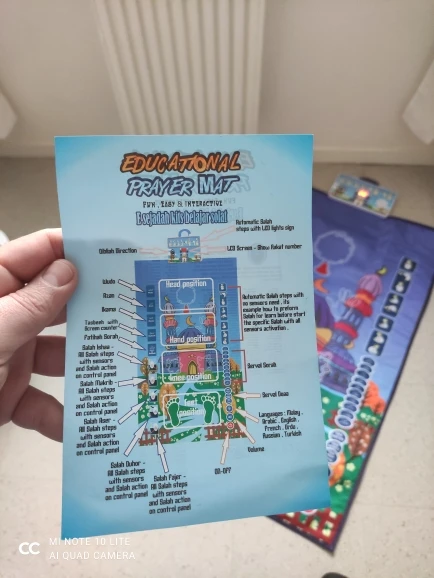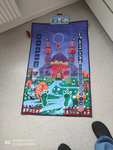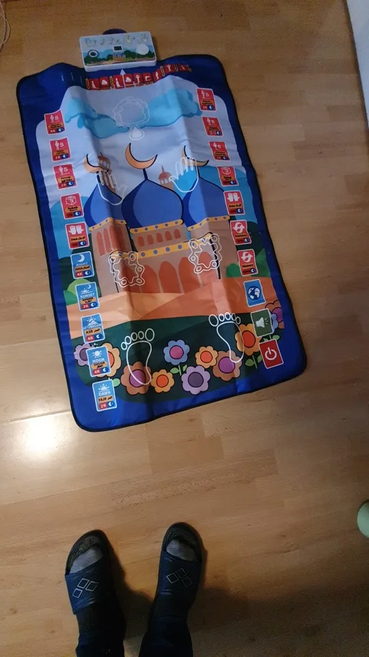-Jest to dywanik modlitewny zaprojektowany, aby edukować dzieci, jak wykonywać muzułmańską modlitwę w zabawny i przyjemny sposób.