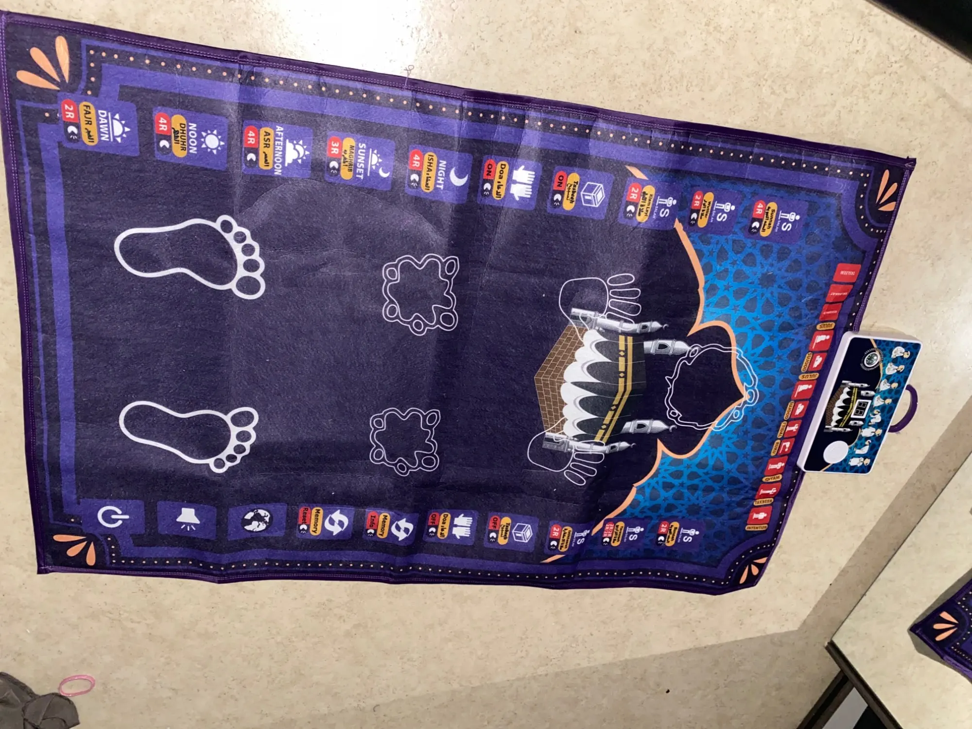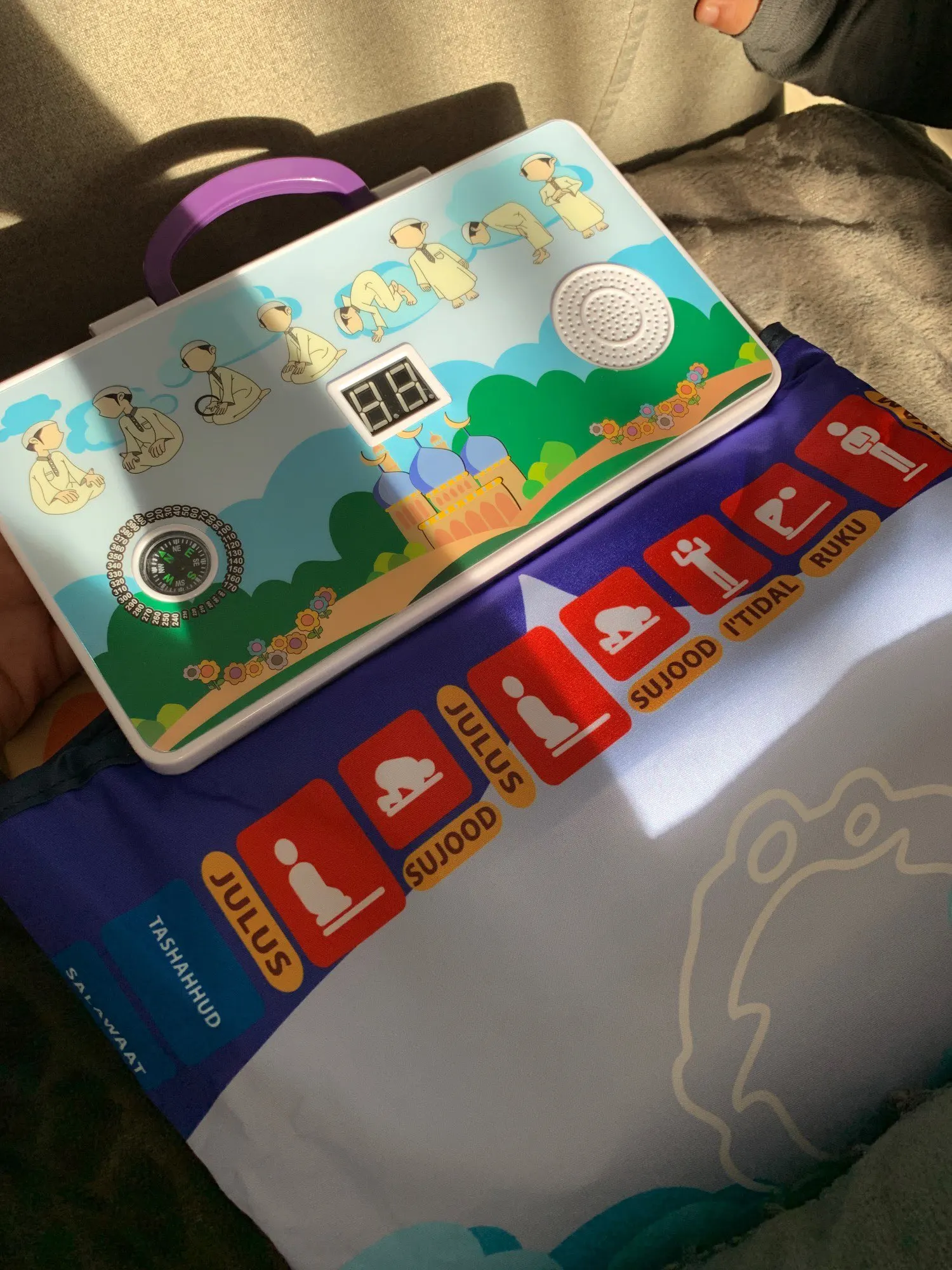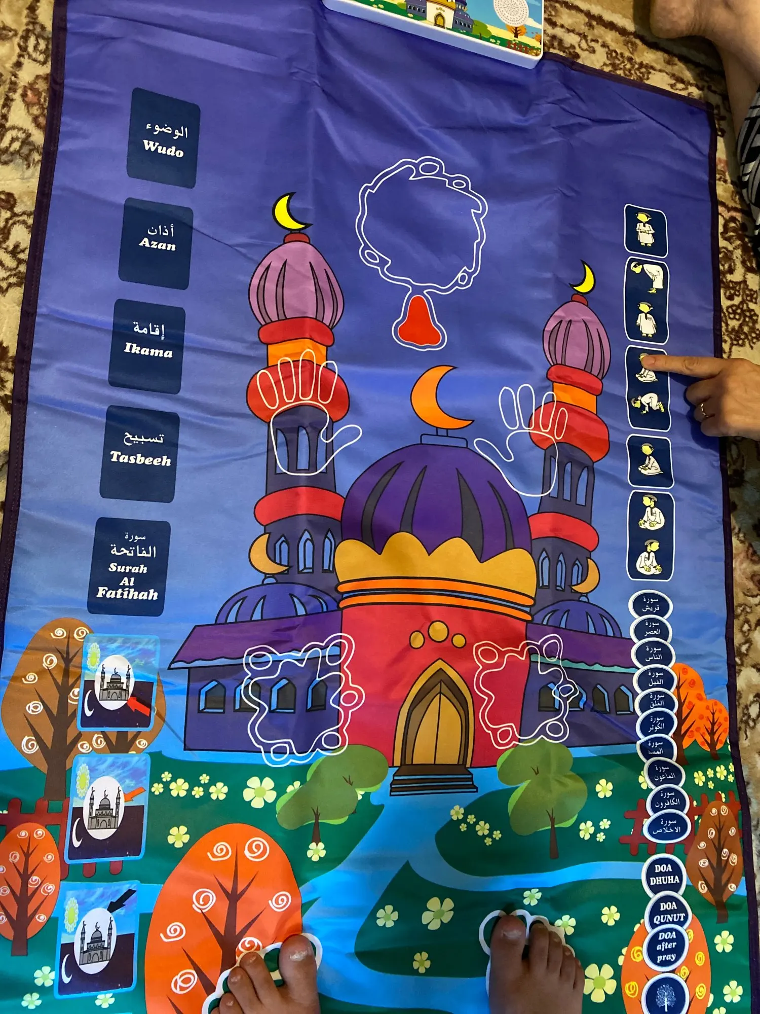 -Jest to dywanik modlitewny zaprojektowany, aby edukować dzieci, jak wykonywać muzułmańską modlitwę w zabawny i przyjemny sposób.