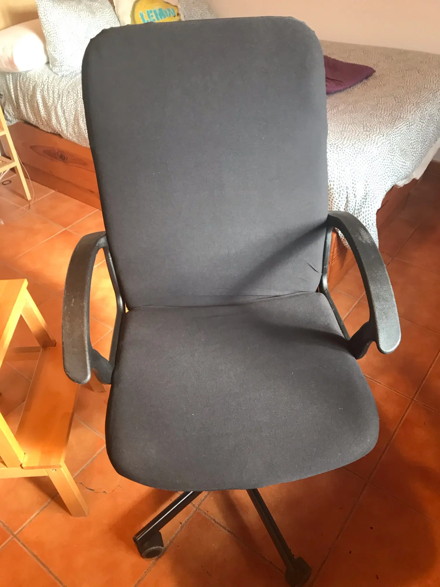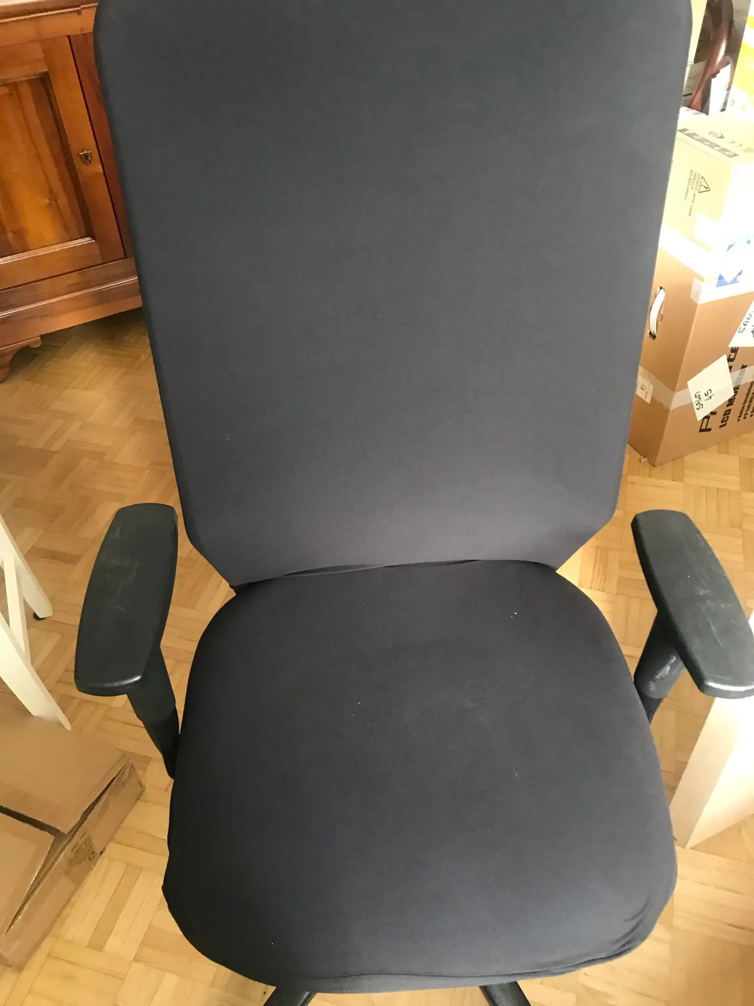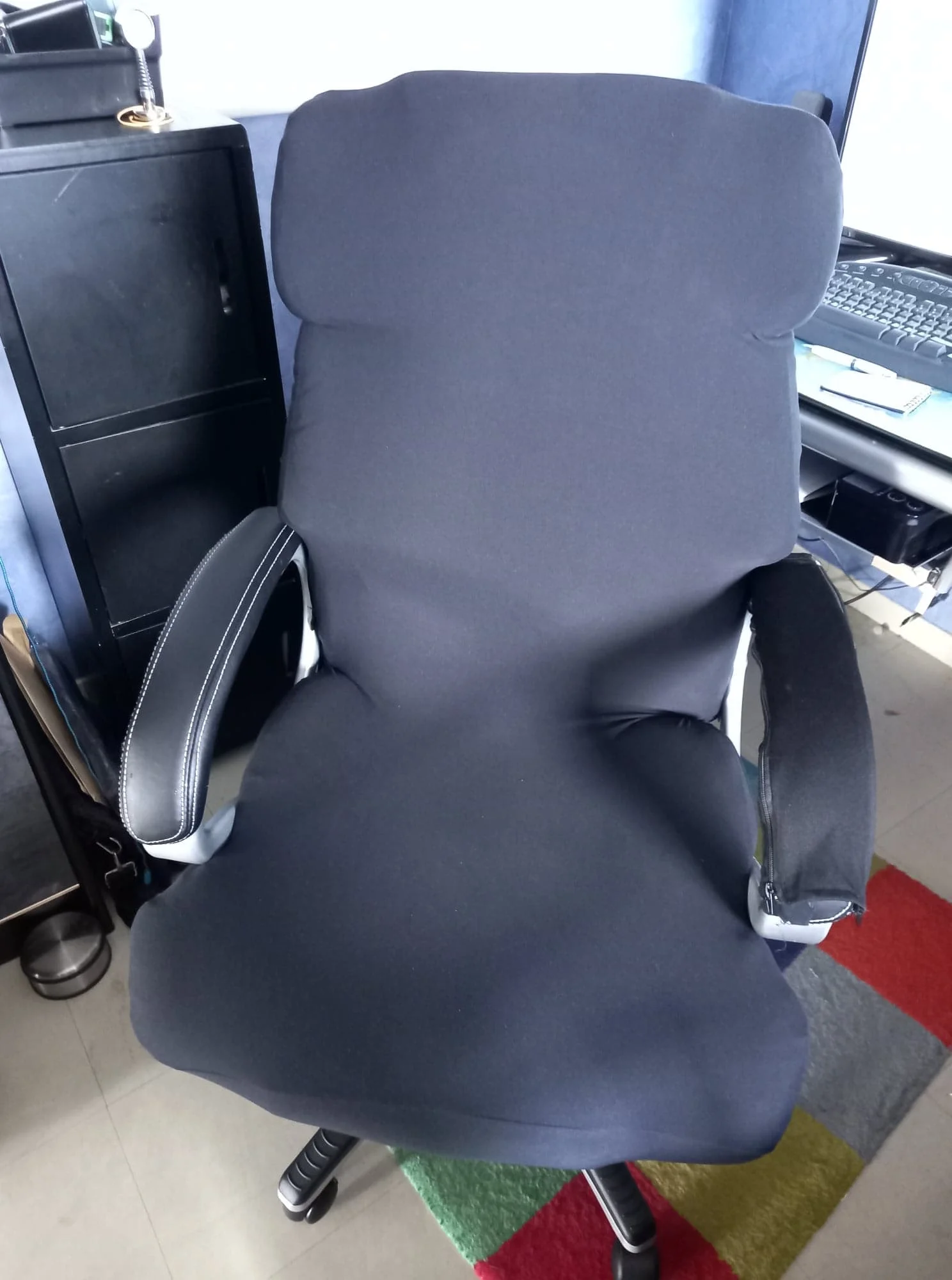 Delighted! fast shpt to France(25/01->08/02) an old second hand office chair became a smart one with the cover, easy to put on just like on the picture I recommend this serious seller