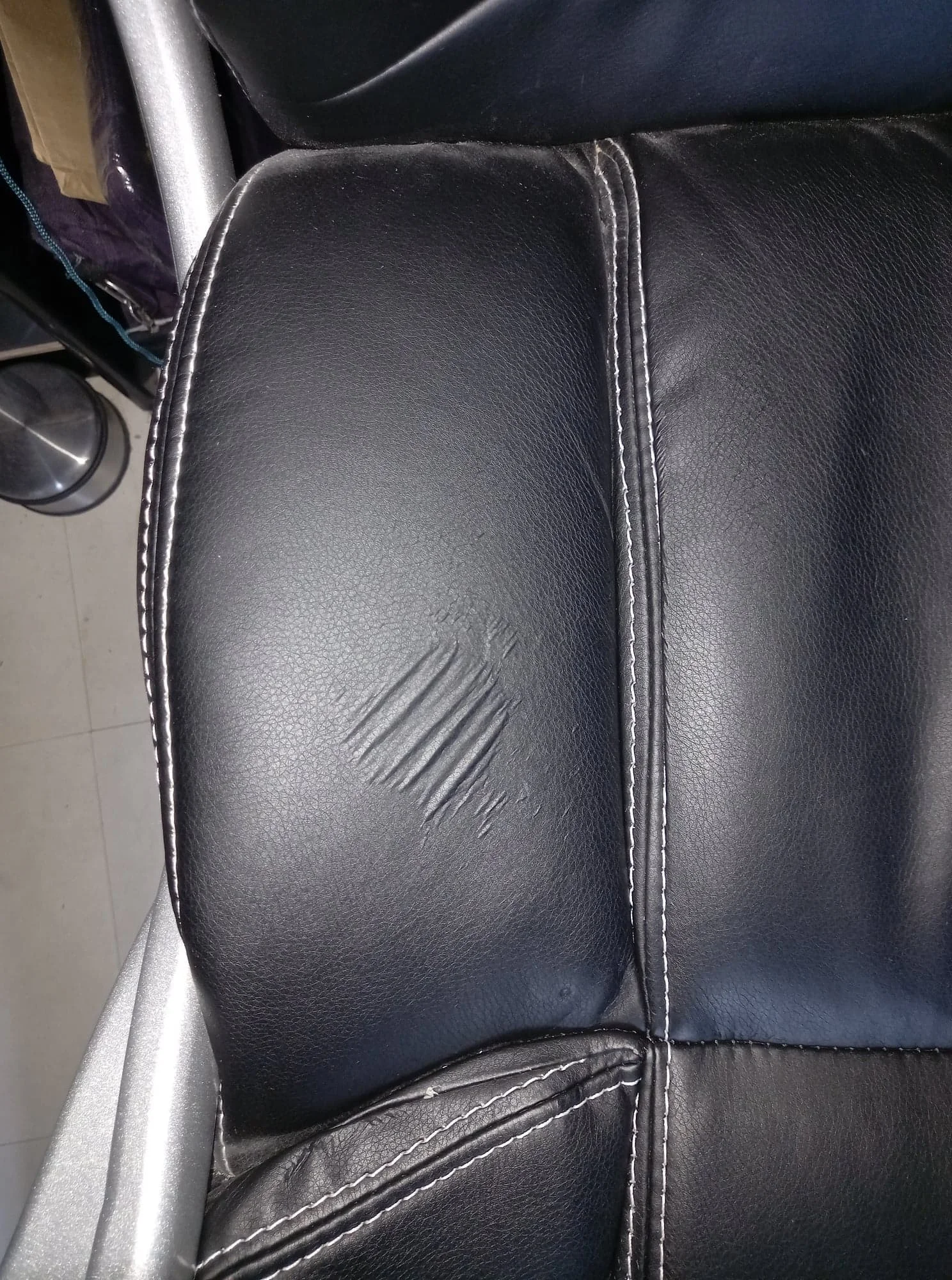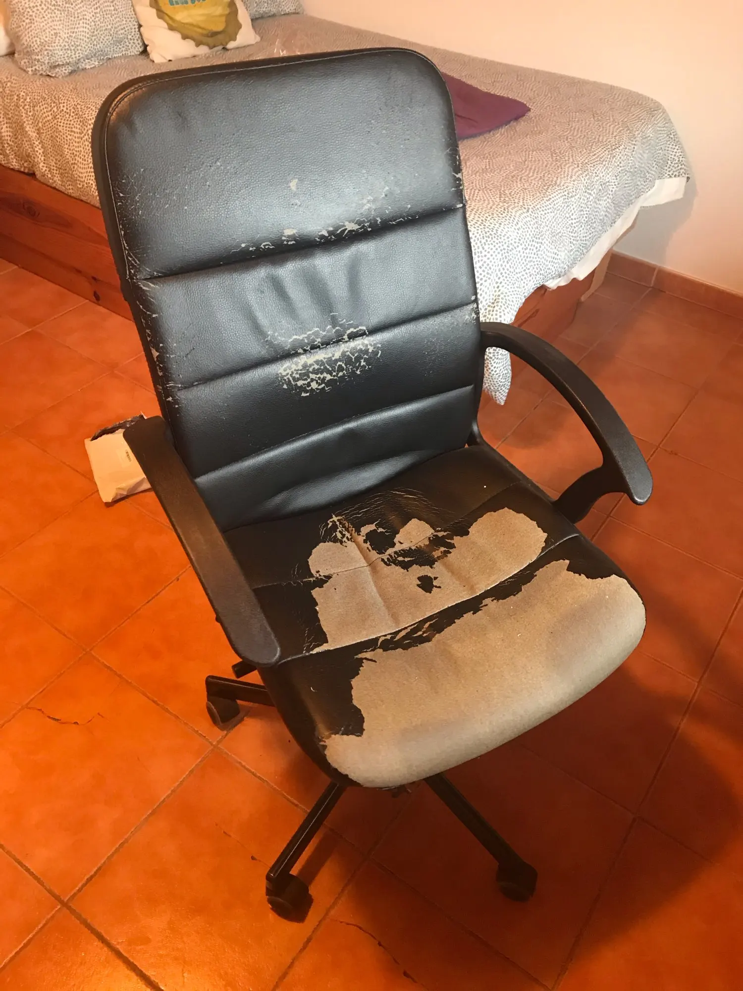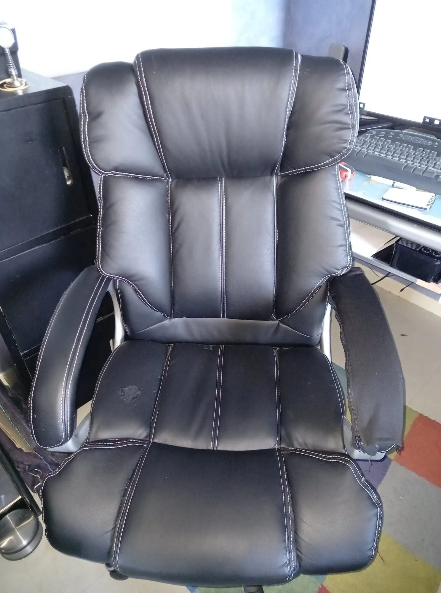 conforme reçue dans les 2 semaines. - photo montrer le modèle du fauteuil - photo du défaut (décollage) tentative de réparation (glue) sans succès. pas la peine d'attendre que ça se dégrade plus pr protéger le reste du fauteuil. Dc ravie de mon acquisition et modèle qui convient bien. pr les accoudoirs qui commençaient eux à vraiment se dégrader, j'en ai pris sur Aliexpress (coussinets d'accoudoirs de bureau, lot de 2 pièces / taille 42x13) à noter qu'il faut en prendre 4 car accoudoirs trop larges dc il en faut 2 par accoudoirs