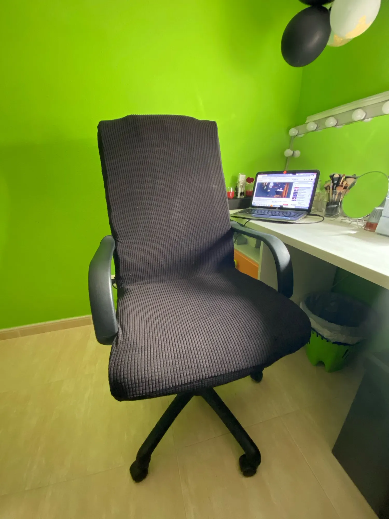 Muy bien, tardó solo 6 días en llegar. El producto es como se muestra. Es elástico y su tacto es suave, como aterciopelado. La tela hace como cuadraditos. Se cierra con una cremallera corta a cada lateral y unos cordones que quedan por debajo del asiento (se coloca muy fácil y queda ajustado sin que esté muy tirante). En mi silla la talla L ha quedado bien, adjunto foto de las medidas de mi silla para que os hagáis una idea. El respaldo de la funda es cuadrado como en el anuncio, yo lo he recogido un poco para adaptarlo a la forma de mi respaldo. La parte de la funda que queda dónde los reposabrazos se unen al asiento queda arrugada porque debería desatornillarlos para poner la funda bien hasta abajo. Pero lo voy a dejar asi para que resulte más fácil quitar la funda para lavarla. Justo están los cordones para atar más o menos por abajo de esa zona, así que la funda no se va a mover aunque no esté bien puesta del todo por esa parte. Por ahora contenta con la compra!