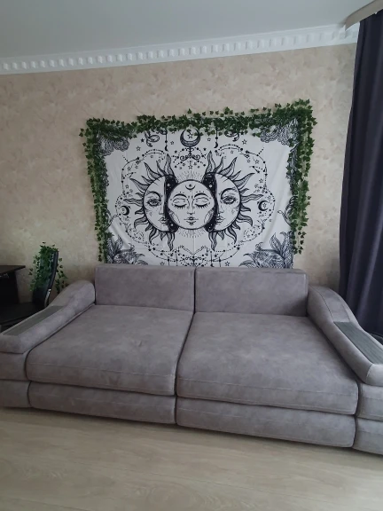 Гобелен просто отличный. Оказался правда намного больше и тоньше, чем ожидалось, занял половину стены. По материалу напоминает шелк, очень приятный на ощупь. Пришел быстро в СПб