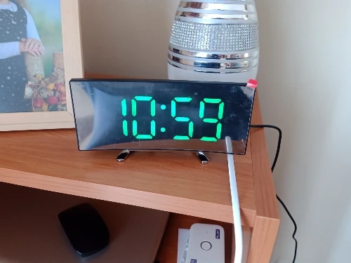 Zielony wyświetlacz LED z 2 gniazdami: cyfrowy budzik ze specjalną zakrzywioną diodą LED sn, możesz wyraźnie zobaczyć czas pod wieloma kątami. Dioda LED automatycznie ściemnia się w trybie nocnym i świeci w ciągu dnia.