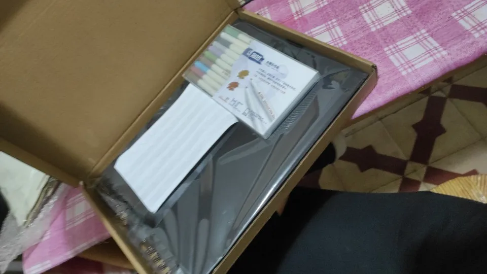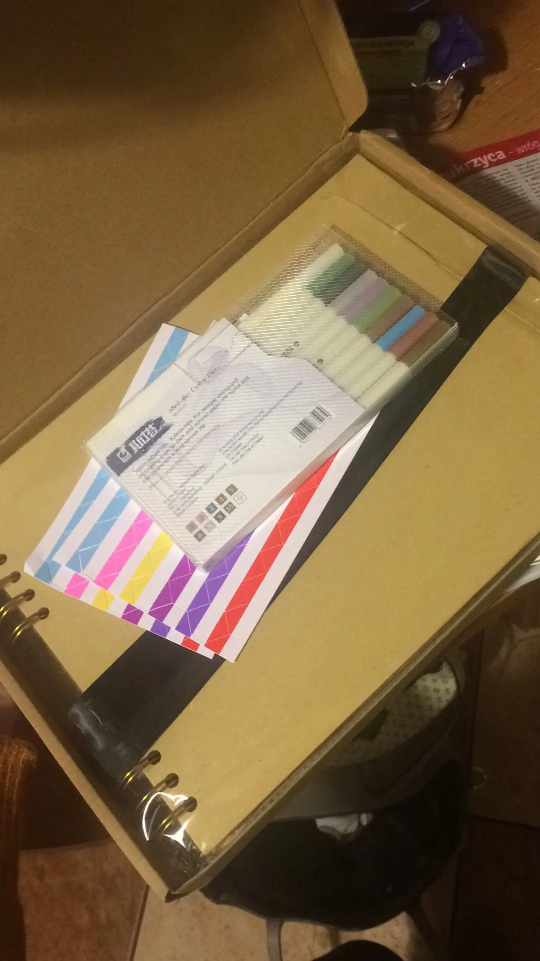 Album i pisaki przyszły nieuszkodzone. Pisaki pięknie piszą po białych i czarnych kartkach. Album również piękny :)