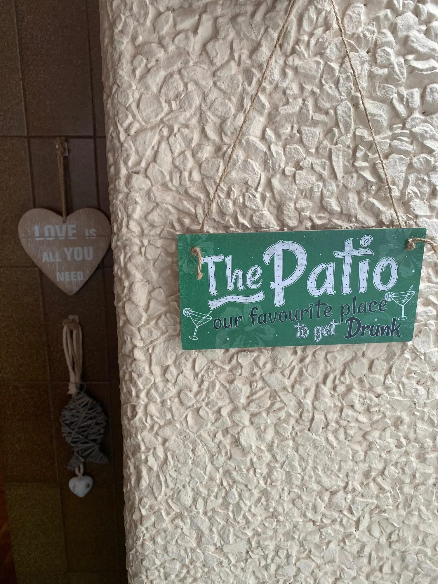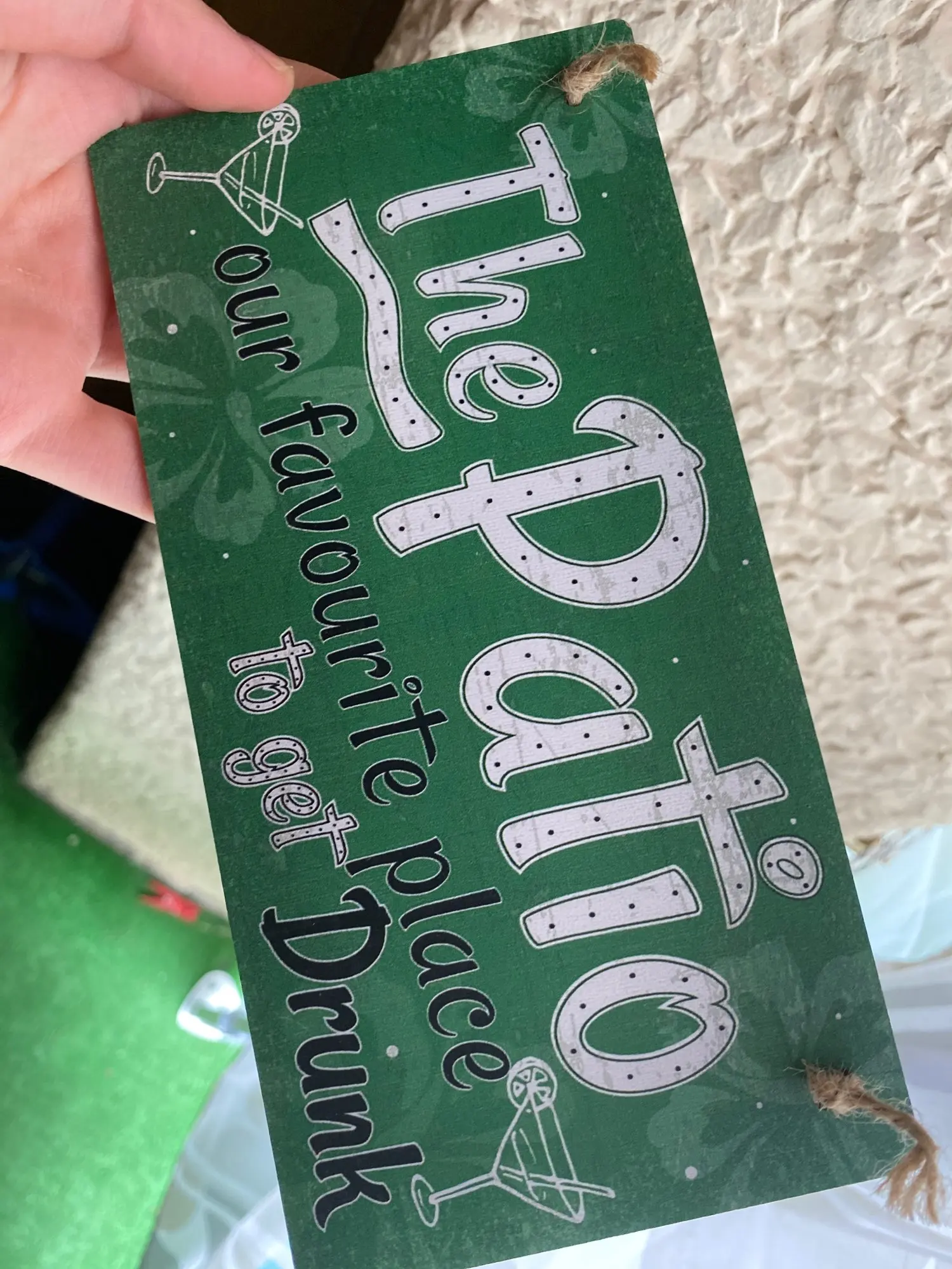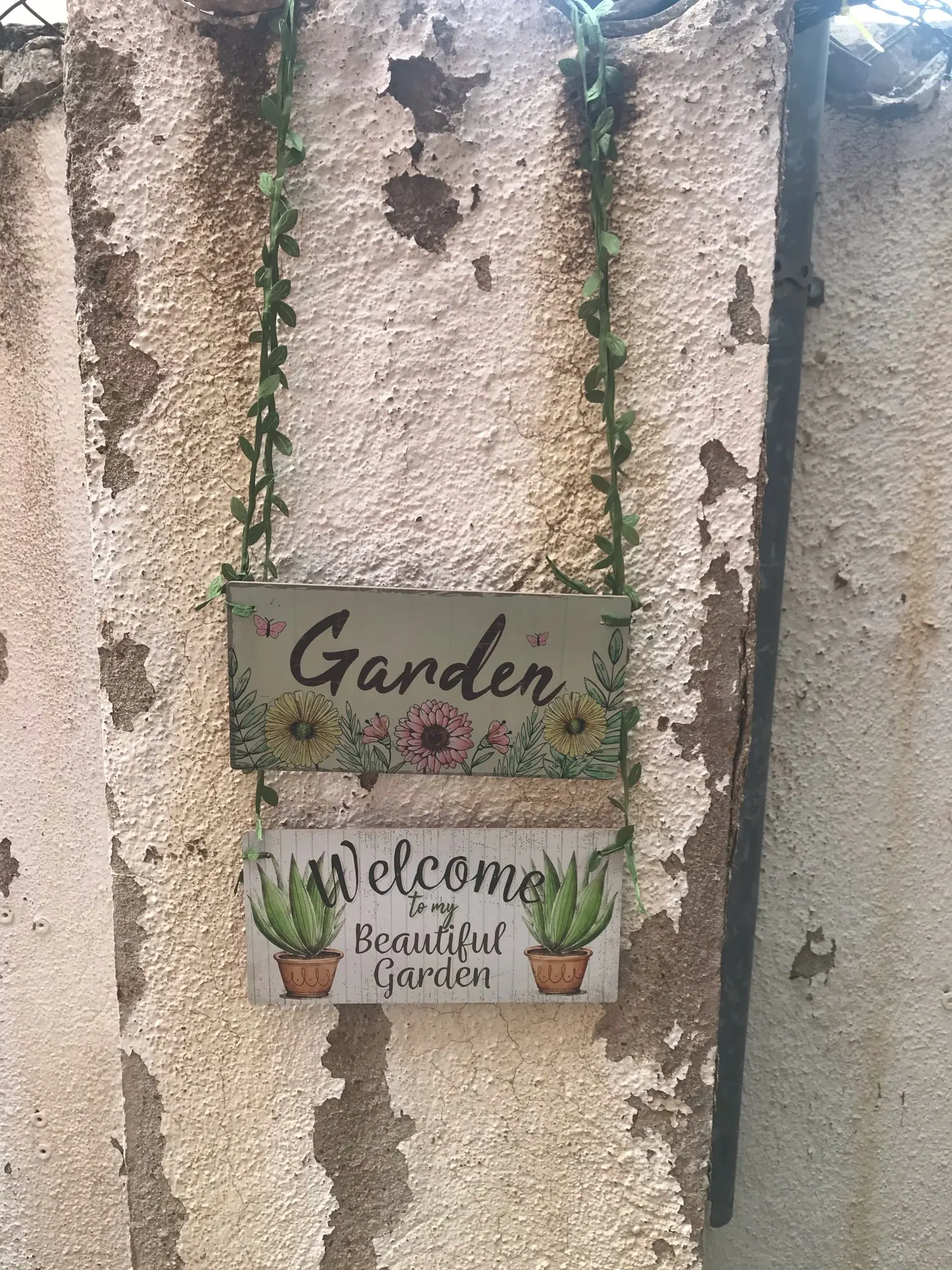 Quedan muy “cuquis”, pero al ser de madera, no se si aguantaran mucho tiempo en el exterior..... un veranito si! Hay q pintar la pared.... lo sé ! Les he puesto este cordel “de hojitas verdes”, el que incluye es un trocito de cordel marron normal