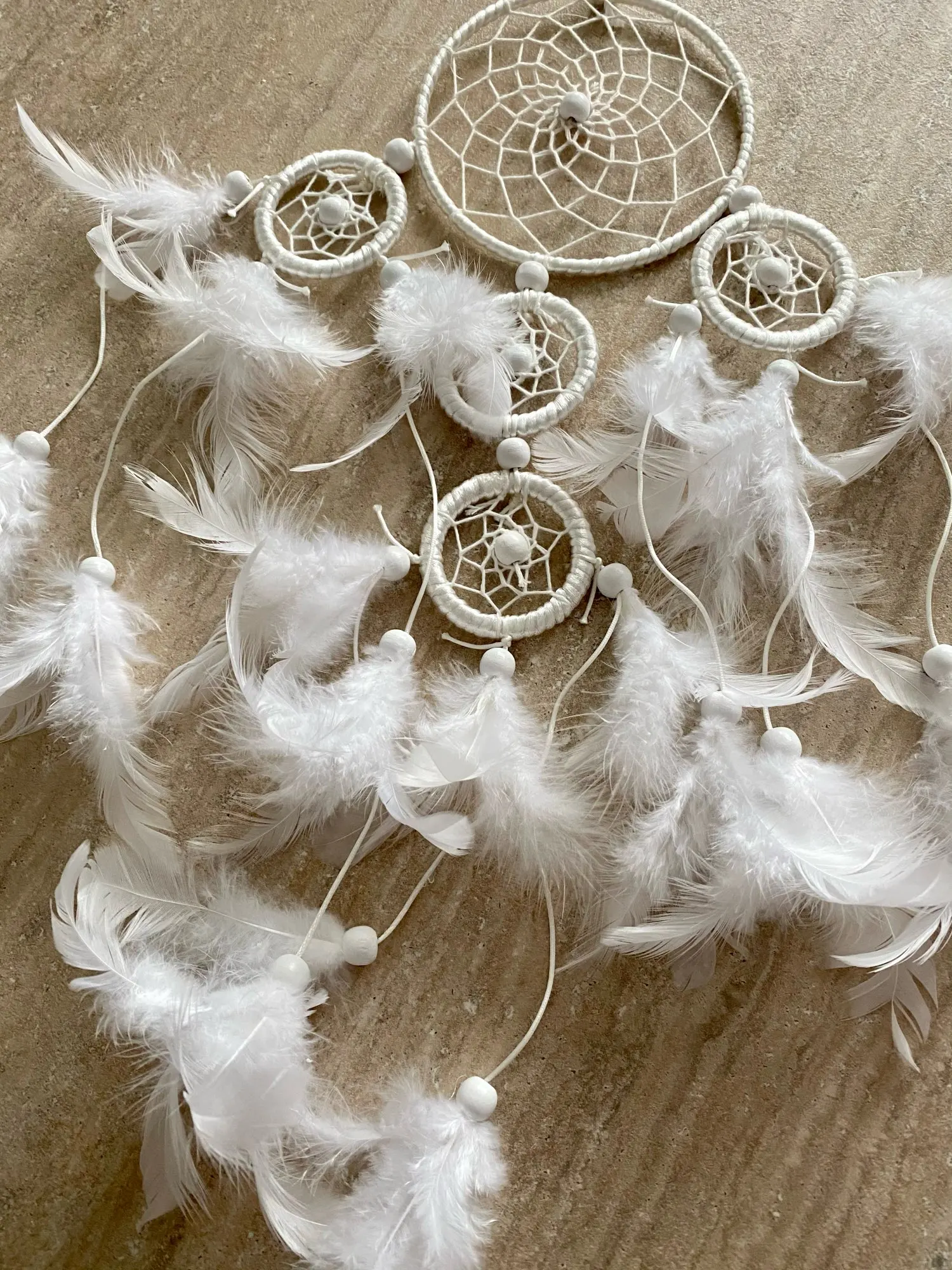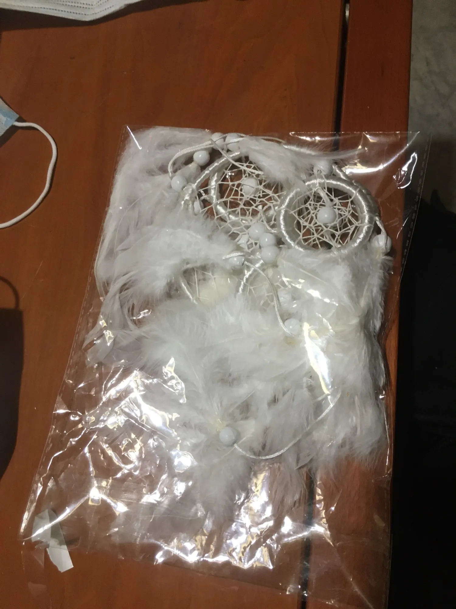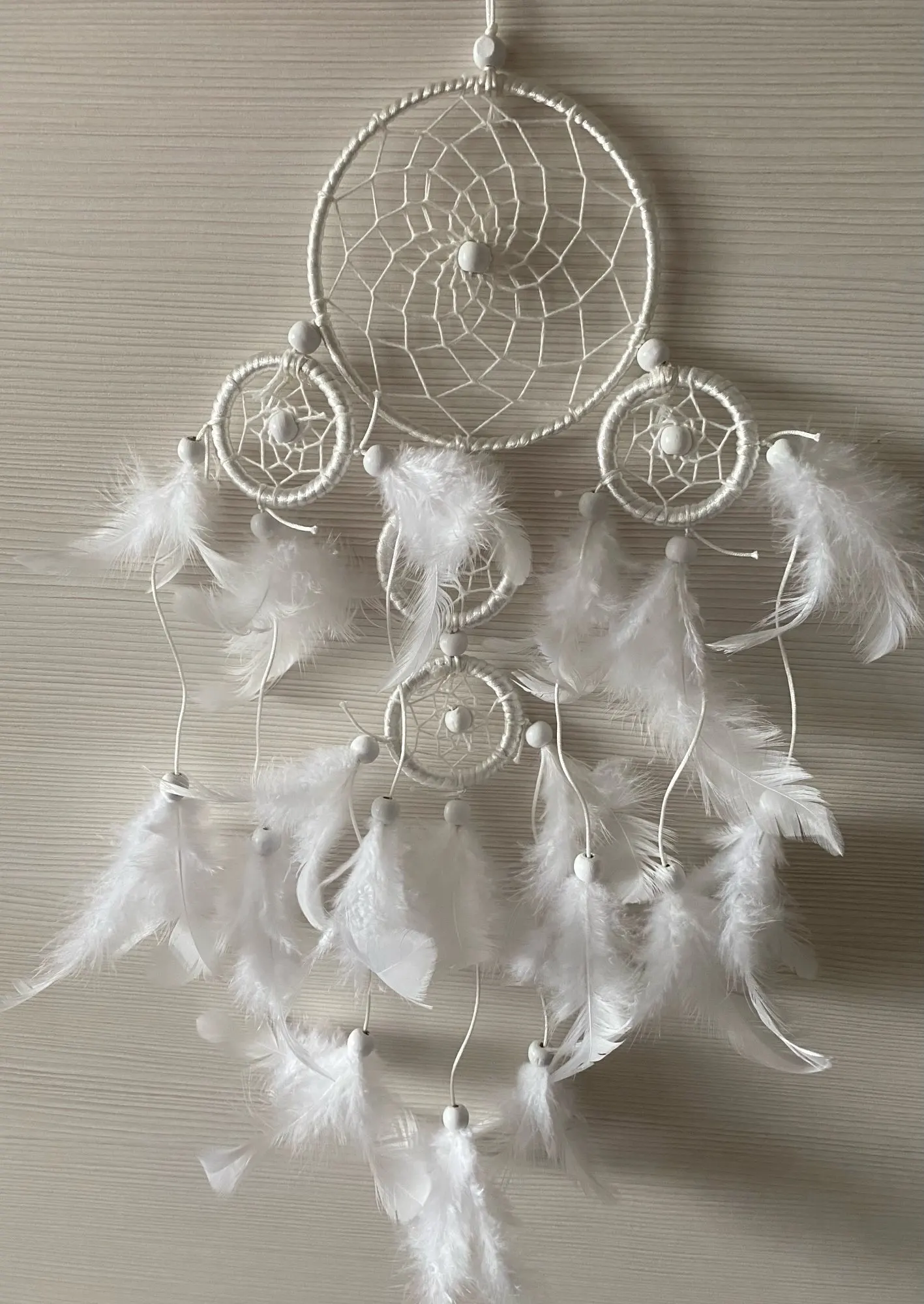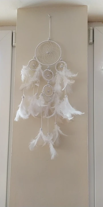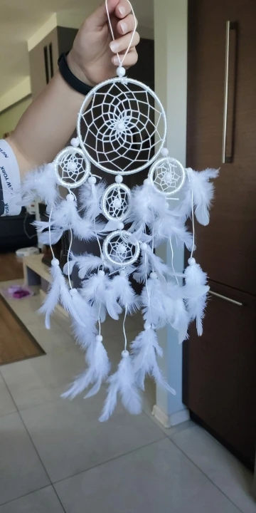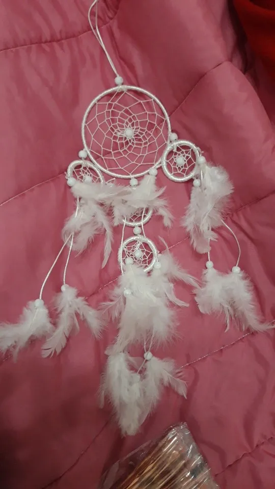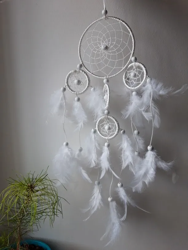 Materiał: żelazne kółko, pióra, biały koralik, linia satynowa